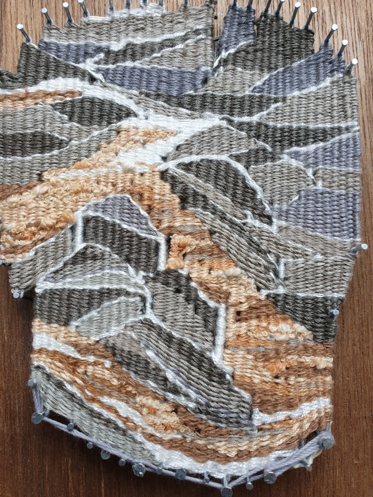 While I focus upon the production of screen-printed one-off textile artworks, I wish to increasingly experiment using collaged imagery with more unique mark-making. I aim to use a wider range of printmaking techniques including heat transfer techniques, to forge increased multi-media use and to add to the depth of narrative, to focus upon found natural objects and natural forms from collections, to utilise their surface marks and their place within their immediate environment. I also hope to utilise both printed textiles and tapestry weaving to increasingly site my work in and around relevant environments and objects from such environments. I have started to experiment with slate and stone… to place my work around or on top of natural objects on a smaller scale initially to start to create new interpretations, relationships and narratives with nature and who I am.