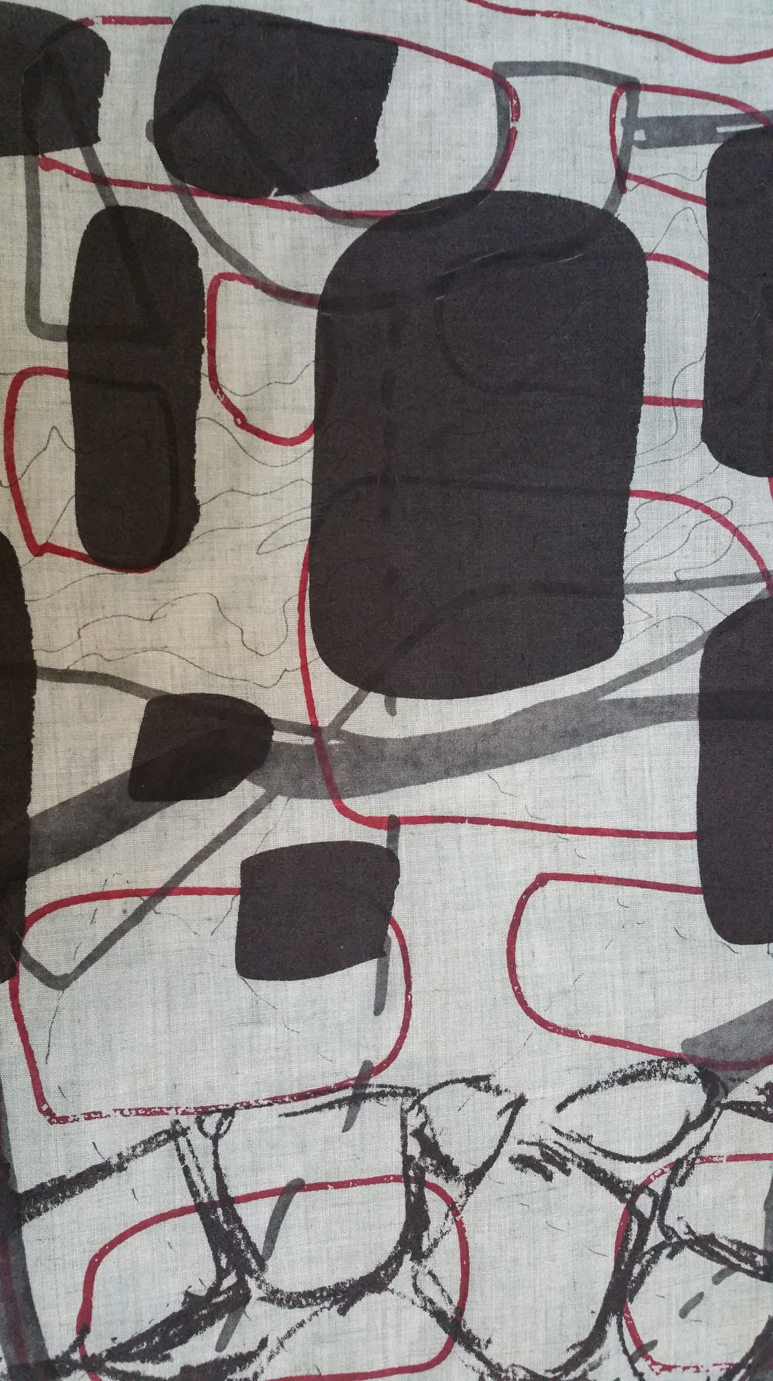 While I focus upon the production of screen-printed one-off textile artworks, I wish to increasingly experiment using collaged imagery with more unique mark-making. I aim to use a wider range of printmaking techniques including heat transfer techniques, to forge increased multi-media use and to add to the depth of narrative, to focus upon found natural objects and natural forms from collections, to utilise their surface marks and their place within their immediate environment. I also hope to utilise both printed textiles and tapestry weaving to increasingly site my work in and around relevant environments and objects from such environments. I have started to experiment with slate and stone… to place my work around or on top of natural objects on a smaller scale initially to start to create new interpretations, relationships and narratives with nature and who I am.