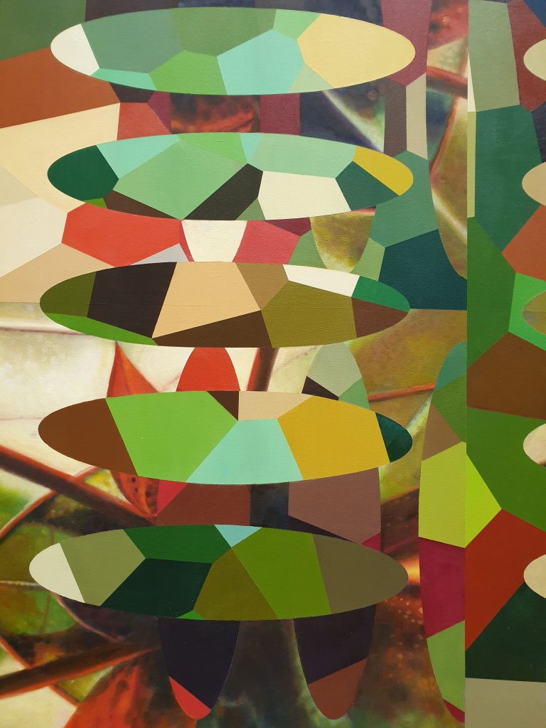 Jim Pattison Redivider (Frieze 5) Acrylic and Oil on Canvas (152cm x 138cm) Myriad of green, mustard, brown and terricotta