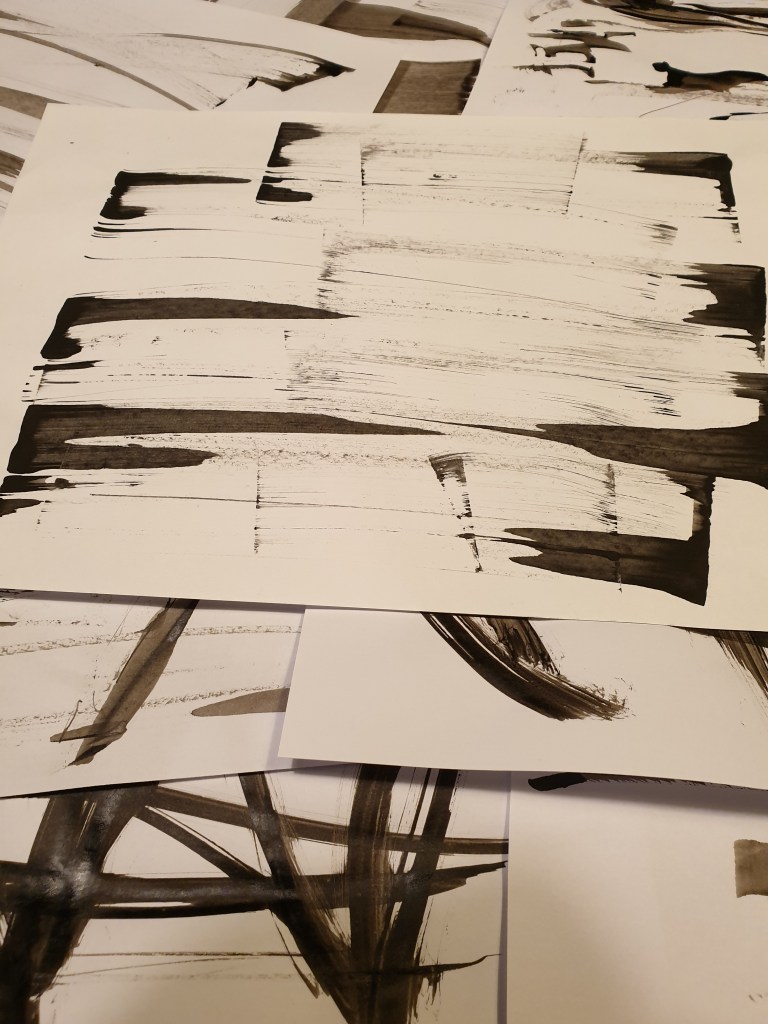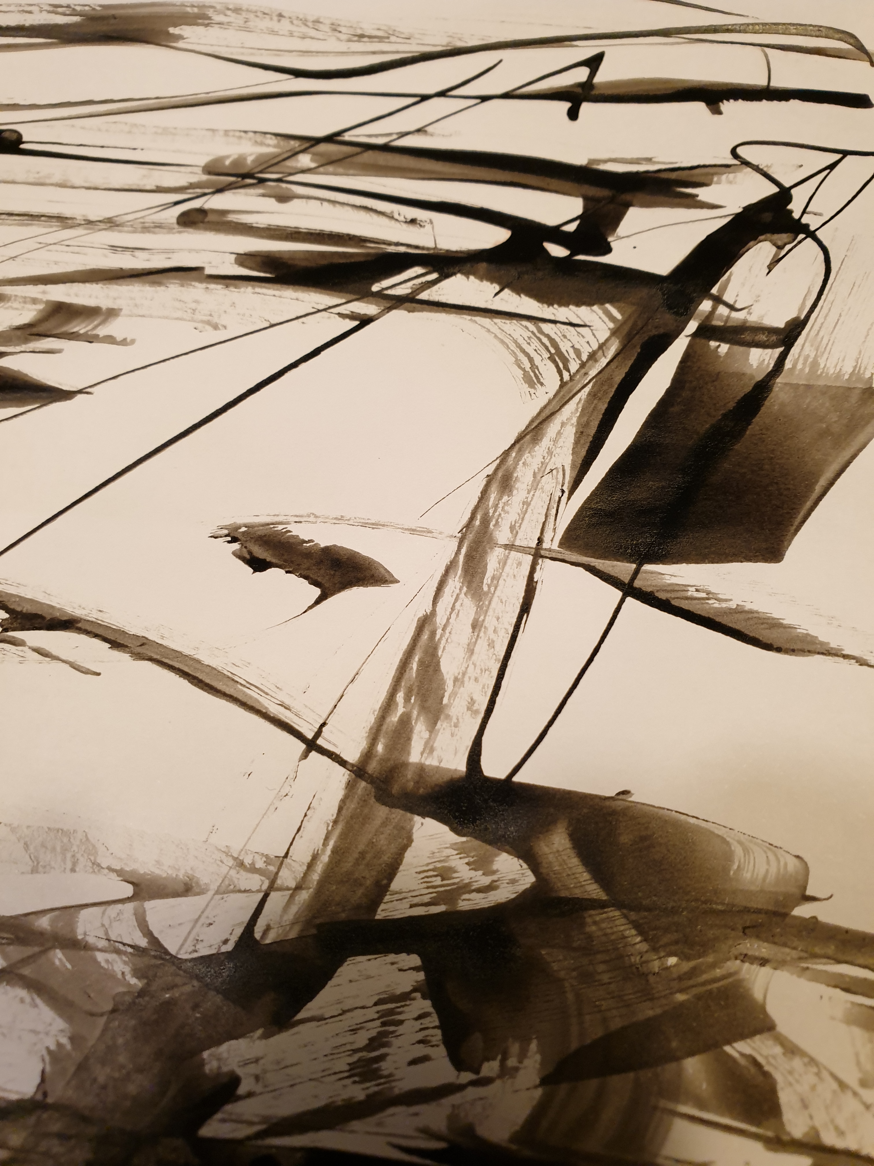 From my previous experiments using Payne’s grey and yellow ochre watercolour washes with black ink, charcoal and metallic silver acrylic paint I started to distil further elements from this artwork. I explored marks made with black ink and translated some of the marks from the previous work while other marks were influenced by the continuing process of experimentation. While I needed to separate out some of the marks made for screen-printing, I enjoyed the process of mark making with black ink for its own sake. I particularly enjoyed the immediacy of the process, of the capacity to be readily influenced from one mark to the next, to alter the course of mark making as I went along.