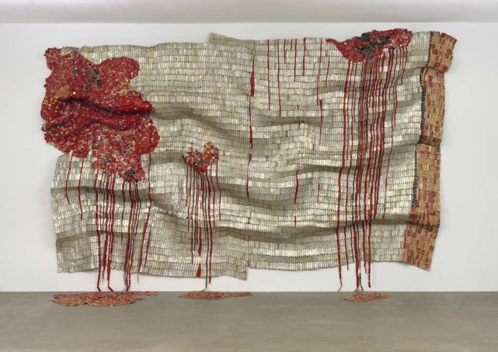 Initially the artist flattened and connected each bottle top with copper wire to form large hanging tapestries. More recently the artist reformed the individual tops which creates increased variation in colour, shape and pattern resulting in intricate circular, square and rectangular designs within the sculptural installations. As the artists techniques developed so did the scale of his work. Such installations with their shifting folds represent the changing shapes of the world. Within Man’s Cloth (and Women’s Cloth) themes of memory and loss continue to be explored and communicated. Ongoing concerns with the damages experienced through the colonial period are focused upon, of the trauma and fragility coupled with the dynamism and strength of African tradition and history. The luminescent colours especially gold relate back to the colonial past as a British colony called the Gold Coast and the reference to cloth signalled the significance of textiles in African societies and historical trade networks.
