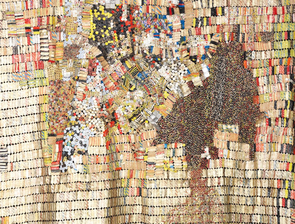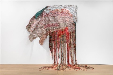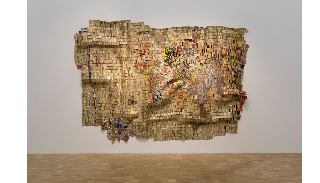 Principally the artist raises questions about ethnic identity by combining Traditional African Techniques and imagery with abstraction which is based within Western art. New World Map references the history of Africa including themes of cosmopolitanism, globalisation and consumption as if a template for understanding Africa here and now. In New World Map Anatsui has been concerned with world history and the future of international relations with the individual experience of everyday life. He has literally redrawn the continents to connect societies that fused historically in the colonial period yet developed as a patchwork in their modern-day existence(Bonham’s, 2019)