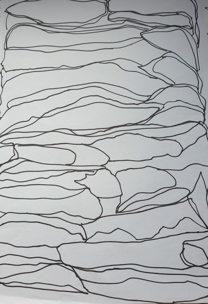 The use of line with black marker pen has been freeing and has loosened up my approach to making art. I am now less worried about making mistakes and instead simply focus on creating the line in the moment, of being submerged in the flow of the line. I really enjoy the process of continuous flow, of not overthinking it, of following the line from the natural surface forms and qualities. I have introduced line alongside a range of different media to incorporate beauty and fragility, of using line as a thread to the context of my creative practice to highlight environmental sustainability versus the effects of pollution and waste.