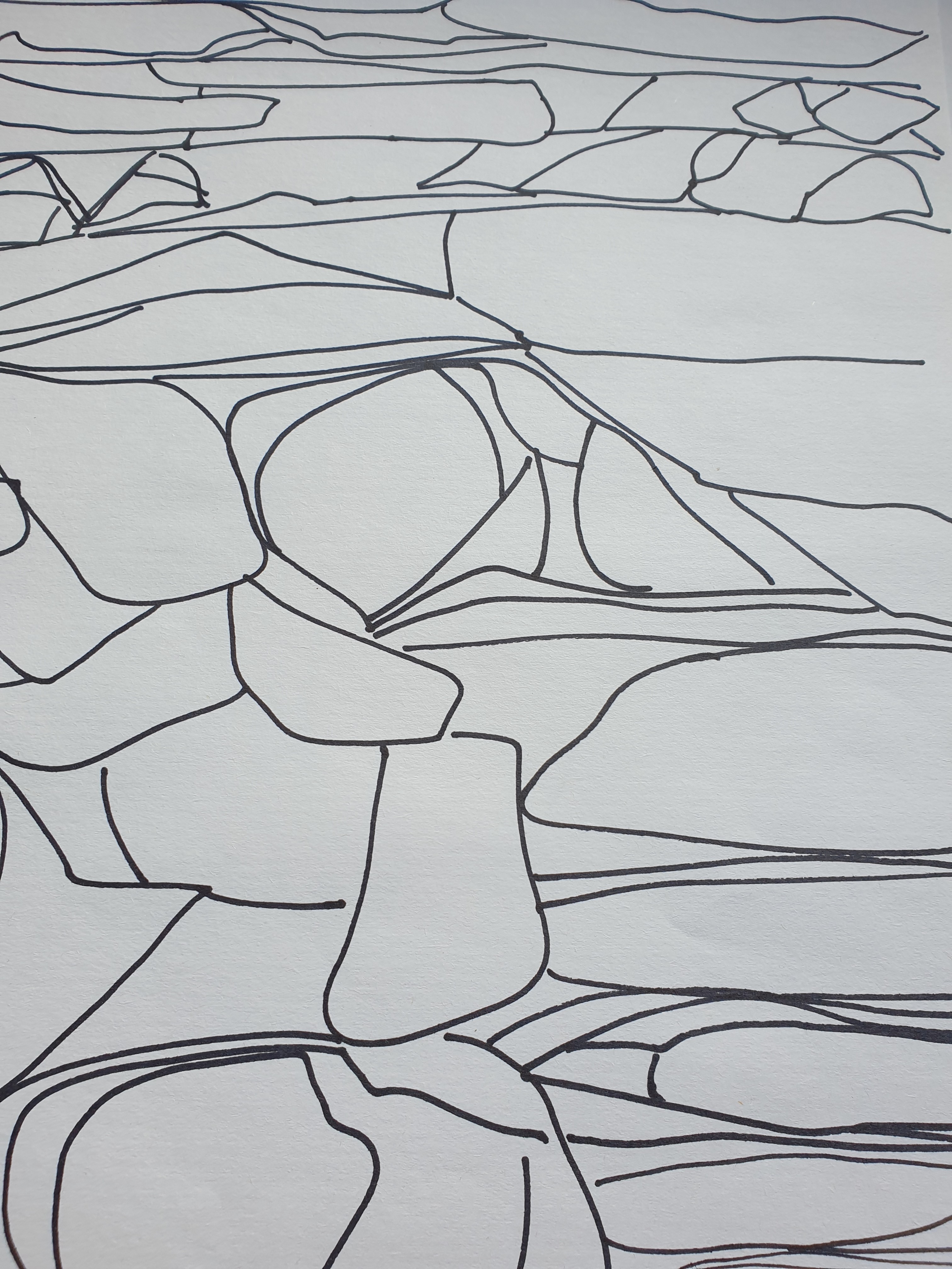 The use of line with black marker pen has been freeing and has loosened up my approach to making art. I am now less worried about making mistakes and instead simply focus on creating the line in the moment, of being submerged in the flow of the line. I really enjoy the process of continuous flow, of not overthinking it, of following the line from the natural surface forms and qualities. I have introduced line alongside a range of different media to incorporate beauty and fragility, of using line as a thread to the context of my creative practice to highlight environmental sustainability versus the effects of pollution and waste.