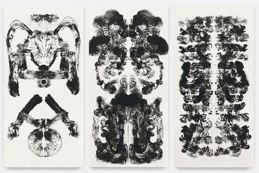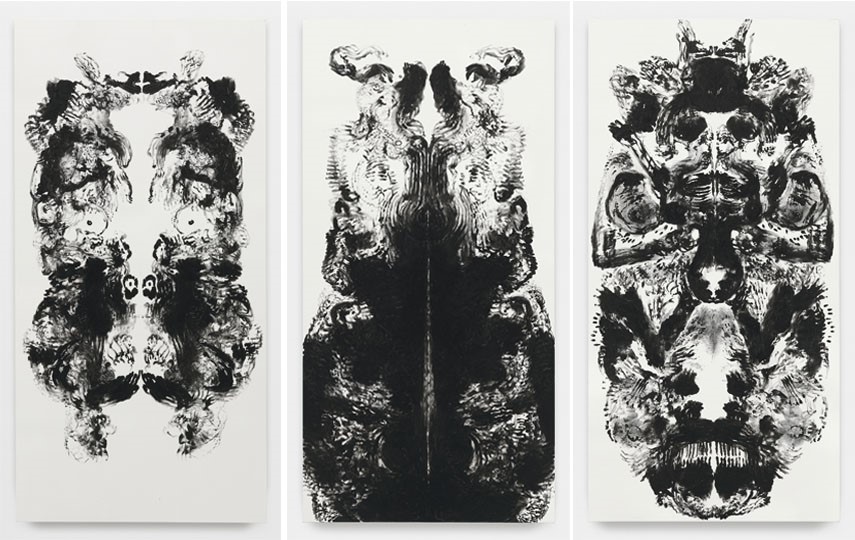 The id paintings were derived from Sigmund Freud’s notion of ‘id’ – the component of our personality structures that fuel our basic, instinctual drives, led by this pleasure principle, it is viewed as the source of all psychic energy. The paintings are the record of actions that appear to be intuitive and guided by instinct, thus echoing the primal, impulsive and libidinal characteristics of the id. They bear an overt, immediate resemblance to Rorschach’s inkblots and they recall the bilateral symmetry of Leonardo da Vinci’s Vitruvian Man. That said the id Paintings have grown out of Wallinger’s extensive series of self-portraits, and they reference the artist’s own body in that each canvas is the width of Wallinger’s 1.8m span, and double that again in height as in da Vinci’s Vitruvian Man. Wallinger uses symmetrical bodily gestures on the two halves of the canvas to mirror one another to replicate this bilateral symmetry of Leonardo da Vinci’s masterpiece. Created by sweeping paint-laden hands across the canvas in active freeform gestures, the id Paintings bear the evidence of their making and of the artist’s encounter with the surface. The artist acknowledged figures and shapes in the material while it was deemed that the viewer would reveal their own desires and predilections while trying to interpret those of the artist as evidenced in Rorschach’s inkblots.