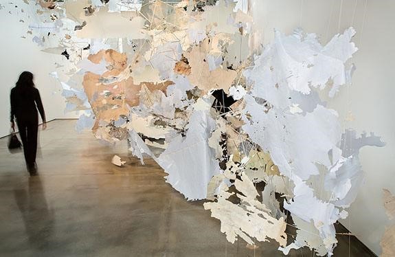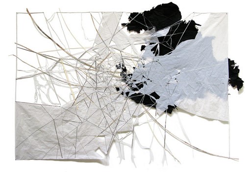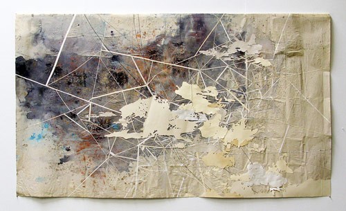 Val Britton creates immersive, collaged works on paper and site-specific installations that explore physical and psychological spaces. Her fragmented, exploded landscapes draw on the language of maps to explore memory, history, and the possibilities of abstraction.