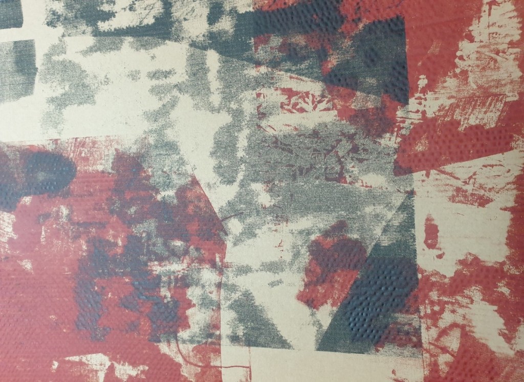 From a series of cardboard prints especially A1 size I felt the more successful outcomes centred around the use of black and brown-red-orange colour schemes with the mixed imagery in use. I felt that the overall size worked well with the scale of mixed imagery. This was helped by the natural brown coloured cardboard and the complementary and contrasting tonal range. As often is the case I naturally gravitated to a more paired back colour range in keeping with the cardboard material. I enjoyed relating with and respecting the physical qualities of the materials I was working with. I felt that I was responsible for promoting the cardboard materials to shine a light on materials which are so often underrepresented in the art world. The surface quality and feel of the printed cardboard surfaces was altered significantly through print. The cardboard distorted fractionally but held its overall integrity which created more impactful results.