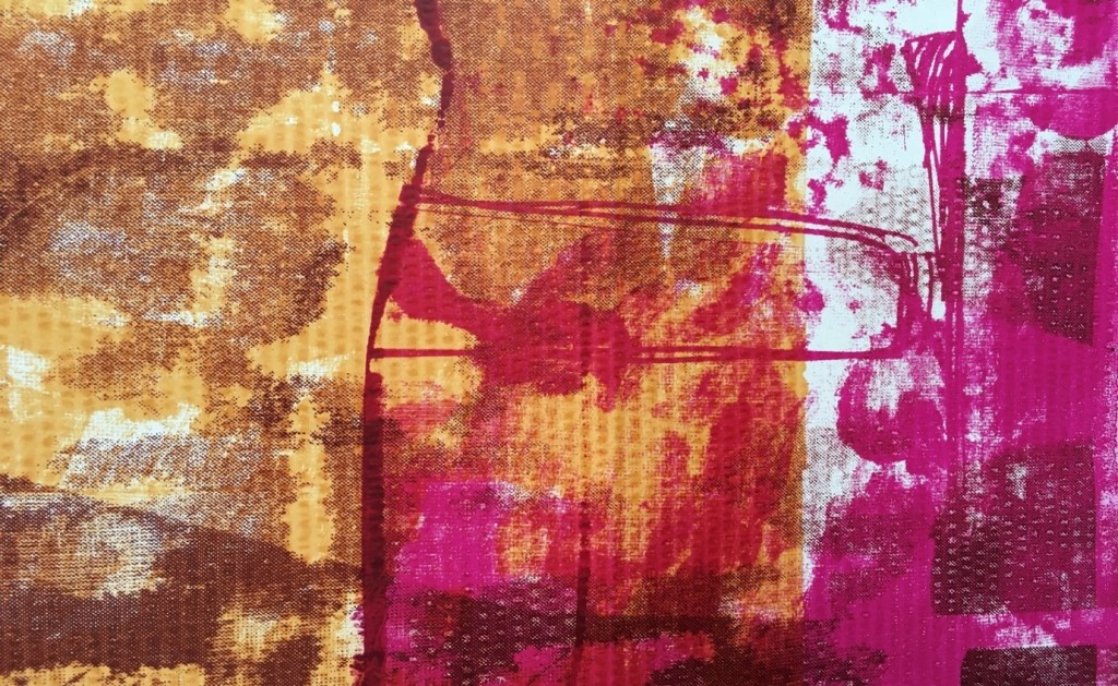 From experimenting on newsprint and other paper types using a range of screen-printing processes I progressed onto recycled cardboard. Several different types of A1-A2 sized recycled cardboard was used with varying thicknesses and surface finishes. While the aesthetic focus of this series of cardboard was to experiment and to explore the effects of print, pressure, and squeegee technique with the screens with and without the use of exposed imagery from prior and ongoing artwork I was also keen to generate art from waste. Different waste materials continued to be used as complementary and contrasting forms of resist including different forms and weights of shredded paper and card of which some of the waste had already been printed on to create additional effects in print. The cardboard acted as an additional recycled material to investigate through print. From using such a mix of materials and techniques so many varying outcomes could be realised. The experimentation processes continued through using up left over colours from previous art projects within the studio space. I selected from colours which offered the most information concerning contrasts, the effects of the resist material, layering and distortion effects as well as investigating how the different surface tensions and finishes responded to different printing inks. The use of the materials reinforced and connected with the context of environmental sustainability and minimising waste. I particularly enjoyed using recycled materials with waste products, it supported the core purpose of my artwork.
