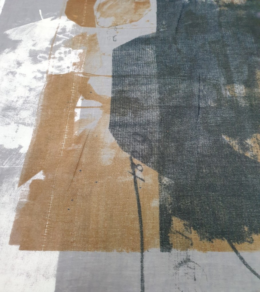 That the continuing colour applications on the sheer muslin produced enough light and shade, variation, substance, overlapping and layering to create complex, impactful, and unique printed textiles. which has been set against the fragility and fragmentation of the fine materials used. The aim going forward was to continue to capture such fragility within the imagery and the material used but to create larger scale statement pieces, to be bigger, but more subtle in the application of the screen printing processes including the colour palette. In considering the knowledge gleaned from working on sheer muslin including the preferred colourways and techniques I felt adequately equipped to increase the scale of the imagery and technique to a size beyond what I had worked on before.