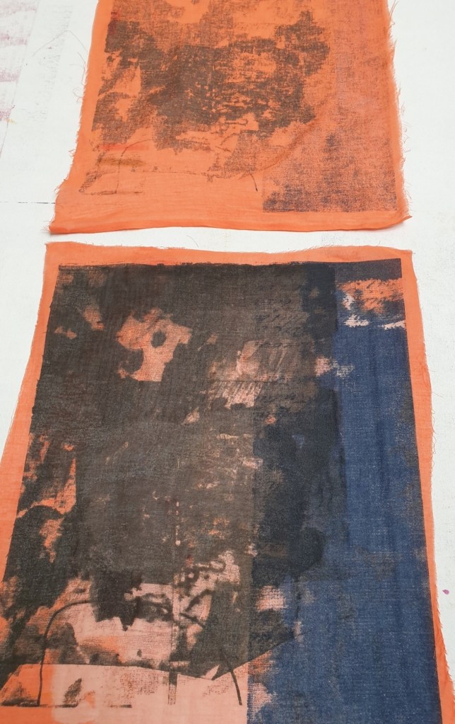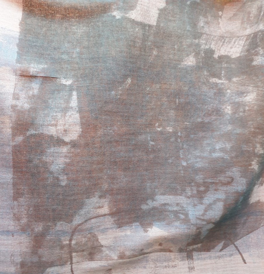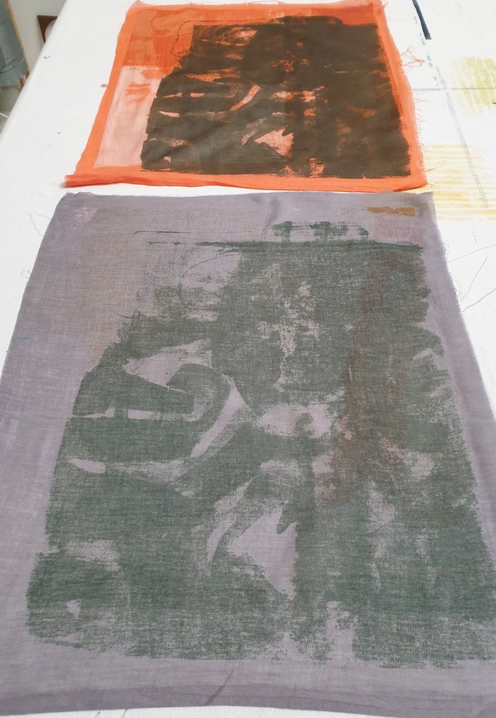 I was once again drawn into the melding and fading of colours alongside the variability of textural marks used… intuitively working with the fabric and its properties. I was conscious of being led by how the materials responded to the printing inks in use and how the overlaid colours reacted with each other, of the interplay of material and myself which led onto realising preferred colour schemes. The light grey, dull yellow and blue worked particularly well on the light grey coloured muslin cotton. This sampling process involving imprints as much as prints enabled me to select a few preferred colour schemes for my larger scale work given how the colour and mark making had interacted with each other. Ultimately, I selected from the samples which emotionally resonated with me most.