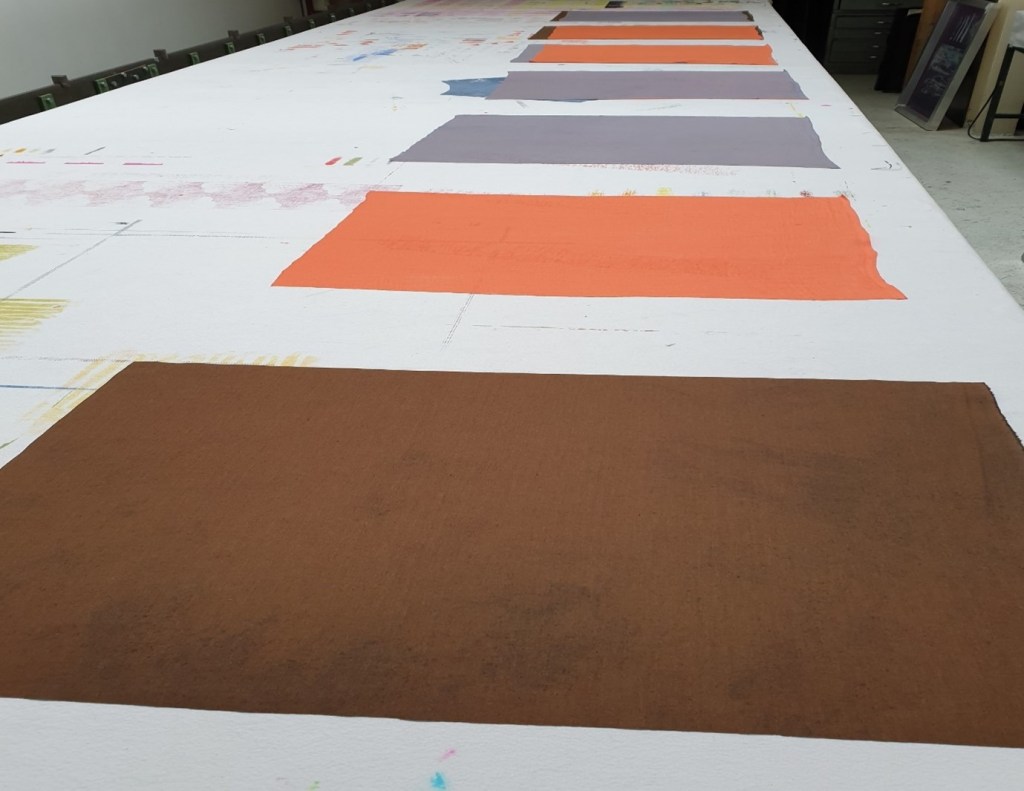 Six metres of hand dyed muslin from a range of sources including reclaimed, second hand and end of roll surplus was used alongside two metres of recycled mixed linen and cotton. The colour palette was led by prior and current experimentation through ink jet print sampling and the application of a range of colour mixes on different material types. Two metres of the linen and cotton fabric was dyed in brown tones while different weights of muslin were dyed in several of the preferred colours including orange, light grey and brown and all were dyed by hand in large receptacles. Some of the material was cut up into a series of 70 x 50 cm sizes to enable sampling across different colourways to offer a comprehensive sampling process to extend learning and understanding of the material and its relationship with print.