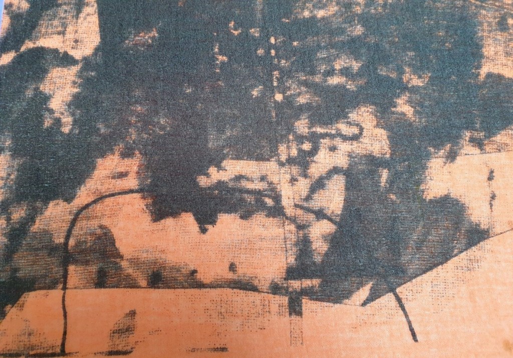 One of the associated screen-printing processes with sheer muslin involved the use of a much thicker, denser, and closer weave cloth made from 50% cotton and 50% linen. This process was combined with sheer muslin to explore both print and imprint on other weighted materials. The material was dyed brown as the base colour to symbolise decay and age, to experiment with and investigate death as the core theme under investigation. Despite the heavier weighted material in use with the repeated removal and addition of printing ink the material looked worn, decayed and worst for wear. I liked this sense of transformation from start to finish as the cotton-linen material became something different and unexpected. The bleaching effects with the print effects worked well together to communicate this process of death, destruction, and disappearance as applicable to environmental change. The idea of fragility was seen from a different perspective through the use and reuse of cloth to disrupt and destroy many of the natural qualities of the cloth to create something akin to environmental desolation.
