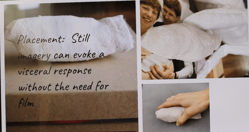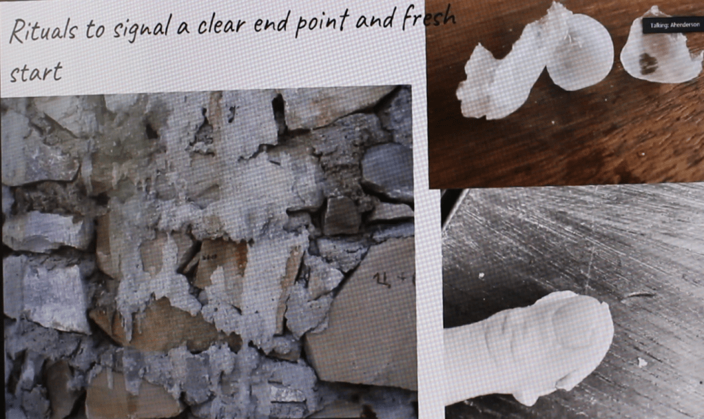 The themes of ritual and performance were interwoven throughout the presentation with the use of materials like polymorph which is a medium which can be repeatedly remoulded and repaired to represent loss and change- emotional repair and recovery in the person.