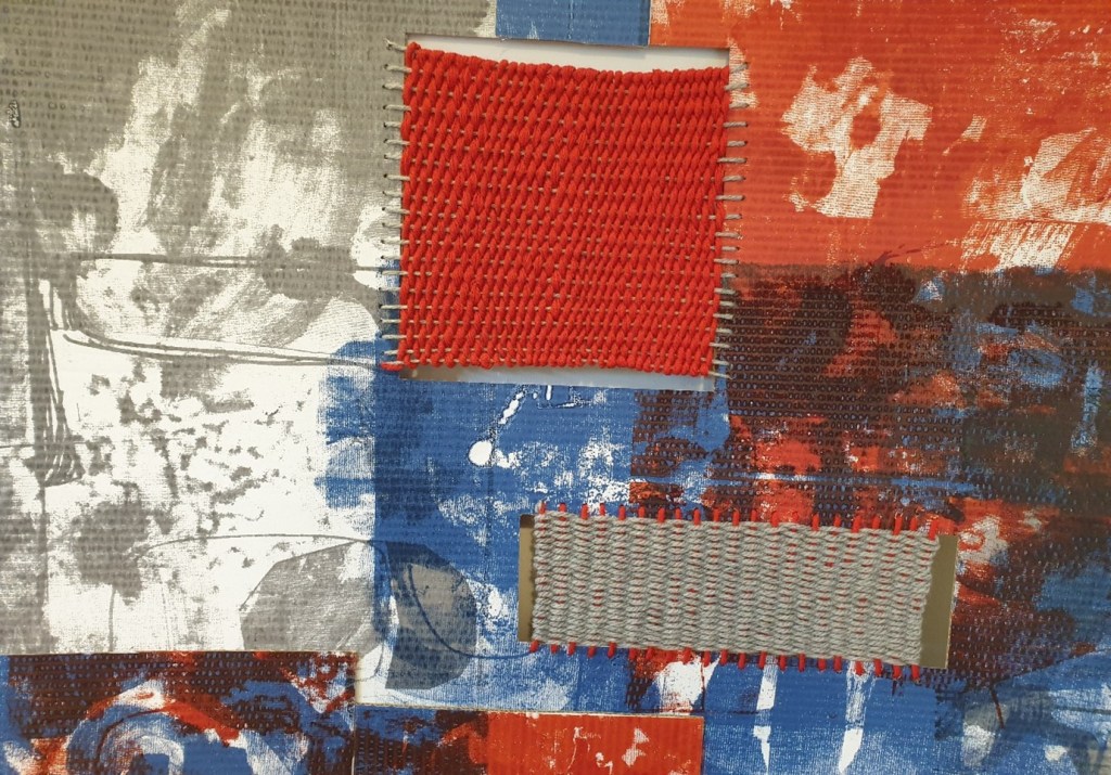 Through reflecting upon my creative process, I liked the surface quality of the cardboard, of its textural qualities after print and the effects created on the cardboard which acted as an impactful contrast to the tapestry weaving and the yarns used. While the colours utilised