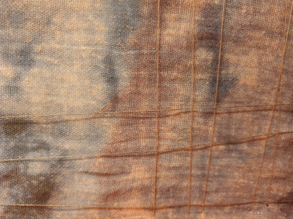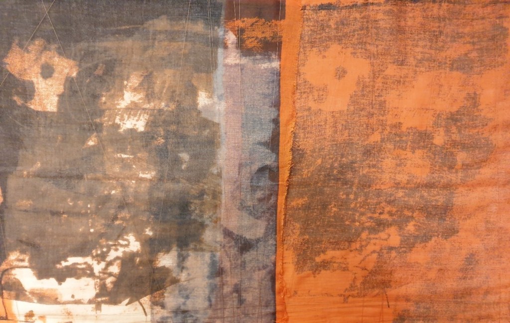 Given all my learning about sheer cotton muslin through related experiencing of this material ideas have continued to be generated concerning the integration of tapestry weaving within this screen-printed material given its loose open weave construction. Through continued experimentation with sheer cotton muslin the scale of my work has significantly increased beyond A4 to encompass A1 and A2 sampling sizes including 70x50cm samples. Once the printed muslin was adequately supported, I explored a range of ways of using weft and warp threads within, through and around the cotton muslin. It felt particularly liberating to move beyond the traditional confines of a wooden frame, to utilise the materials differently. In considering the increased scale the mixture of linen, cotton, and silk threads were used to either compliment or contrast with the screen prints. I liked the contrasts generated from the threads overlapping the cardboard supported printed muslin. There was an increased emphasis on the print given the portrayal of and communication of fragility, fragmentation, fraying and disintegration through the print itself which evolved from prints, imprints and relief -resist imagery from screen printing on recycled paper, card, cardboard and MDF. I felt that such an approach to print and tapestry weaving integrated the related themes of fragility and fracturing to environmental decline and destruction through too much waste and too little reuse.