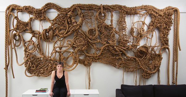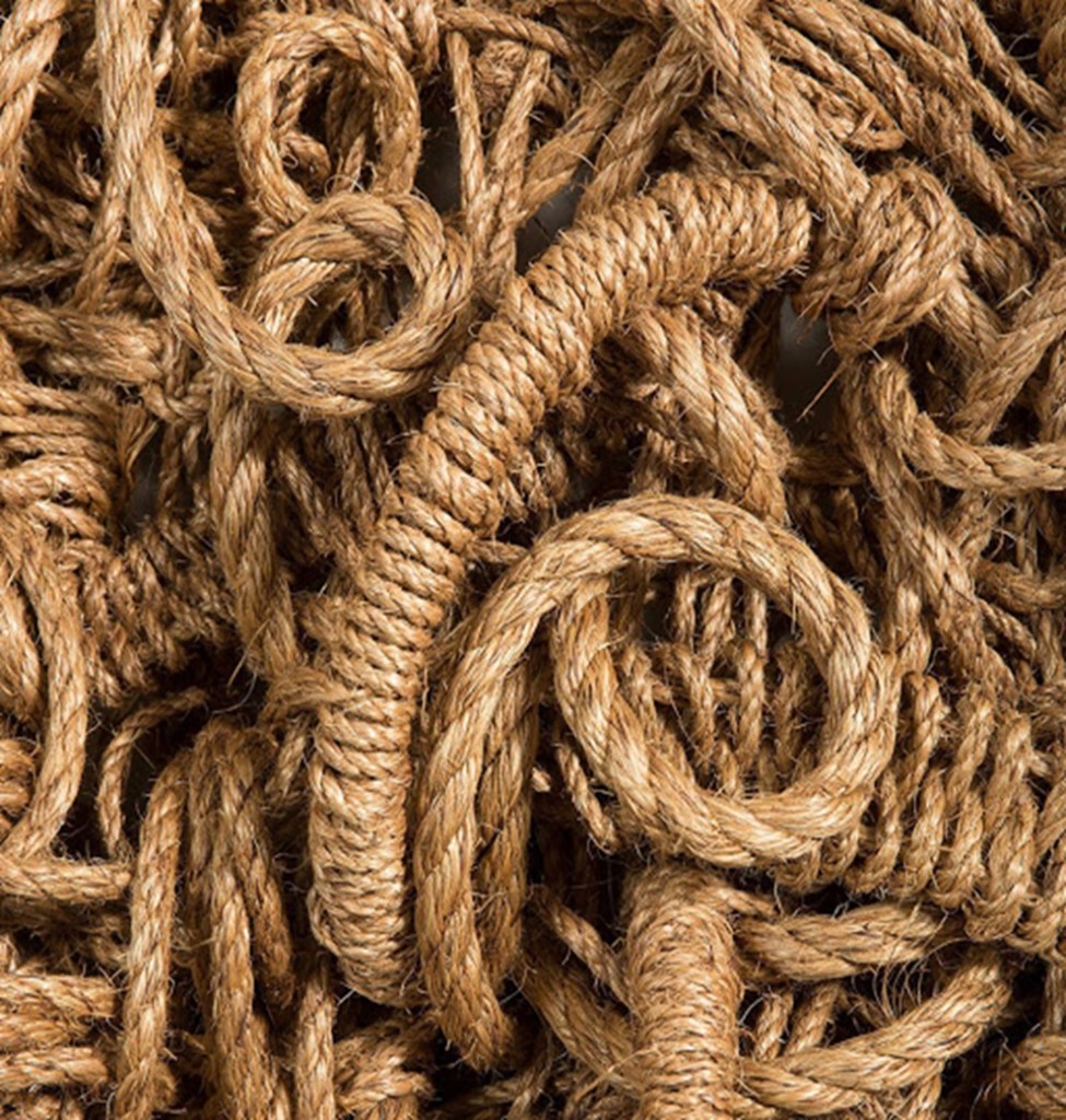 This much sought-after artist uses a ‘free weaving’ technique to create sculptures that reflect the path of countless women as they struggle to hold on to their identity while balancing work, motherhood, and marriage. She sees the power of the work in its scale, and in the narrative embedded within – its swirls of chaos, layers of inner turmoil, and endless knots of stress. These one-of-a-kind sculptures allow her to infuse simple materials with thought provoking depth and profound emotion. This artist works with sustainability in mind. Through these large-scale raw rope sculptures, she expresses and evokes her feelings as such work originated from 2011 and “feeling tied in knots” herself. According to Beallor-Snyder, she wanted “to create work that would represent the most extreme dark side of my life as it was in.” In a search to find the right material to express her feelings, Beallor-Snyder went to Home Depot and saw Natural Manila rope. “It was rough and smelled like some kind of musky oil,” she said. “The little shards were uncomfortable to touch. It was perfect!”