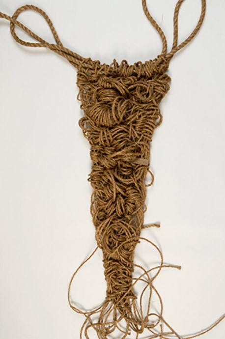 The Manila rope, which is made from natural Abaca fibres, gets its name from the Philippines where Abaca grows. Abaca fibre, unlike most other leaf fibres, is obtained from the plant leaf stalks. The Abaca plant grows quite quickly. Because it is considered a useful plant for staving off erosion, Abaca is thought of as very environmentally friendly. Upon discovering this rope at Home Depot, Beallor-Snyder immediately bought all the store had in stock and returned to her studio where she began weaving and working out how to express her emotions with the rope.