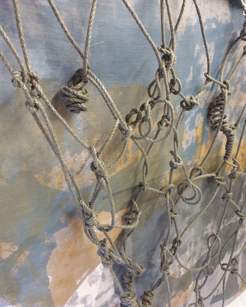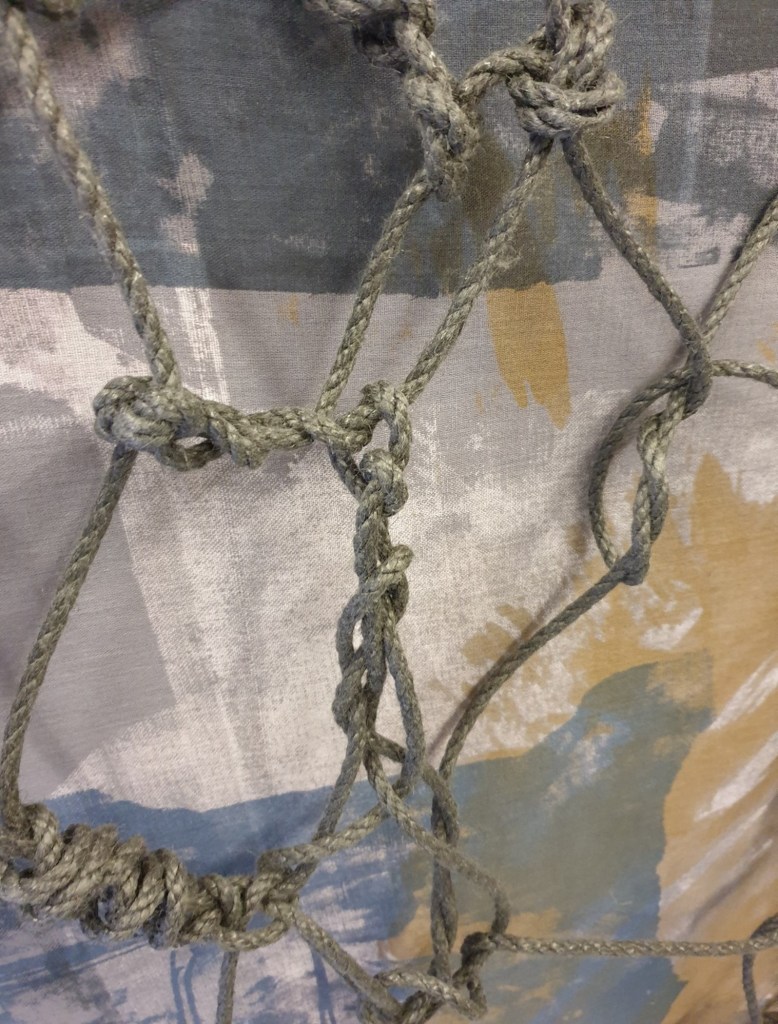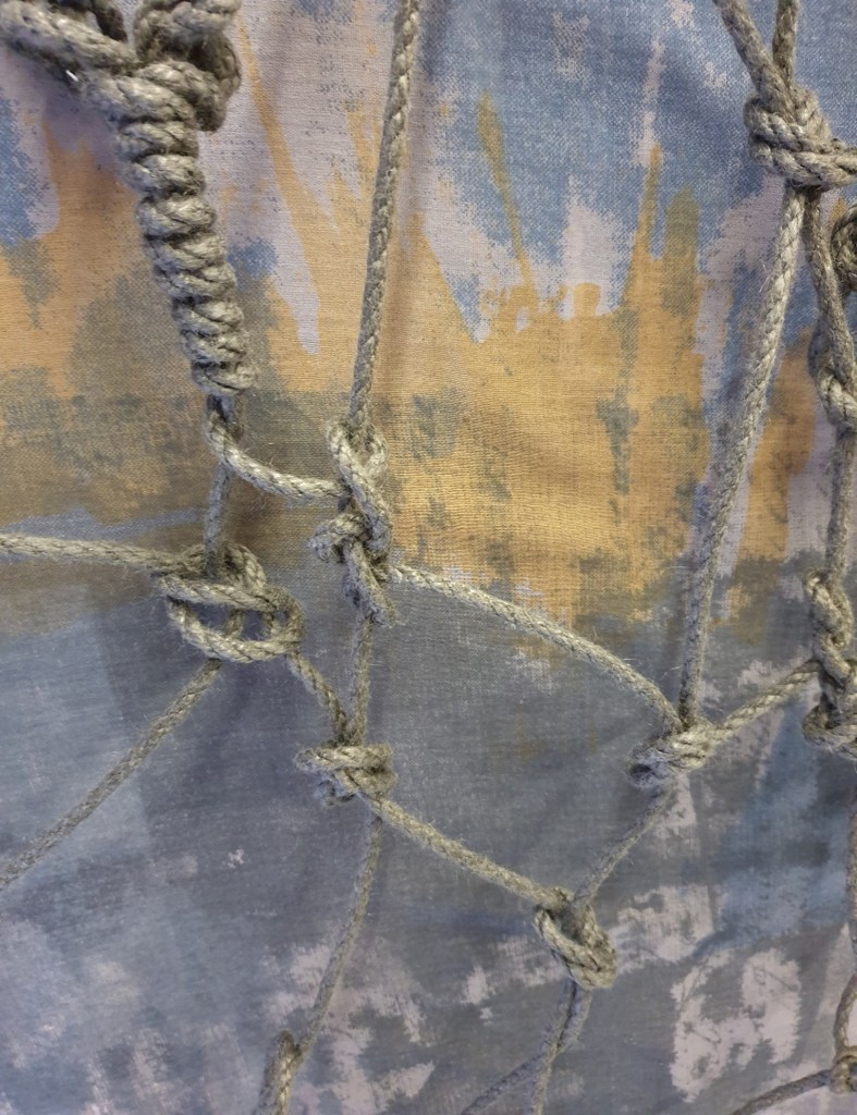 I have been deeply influenced by Susan Beallor-Snyder and her manila rope sculptures. This much sought-after artist uses a ‘free weaving’ technique and sees the power of the work in its scale, and in the narrative embedded within – its swirls of chaos, layers of inner turmoil, and endless knots of stress. These one-of-a-kind sculptures allow her to infuse simple materials with thought provoking depth and profound emotion. The artist searched to find the right material to express her feelings, Beallor-Snyder went to Home Depot and saw Natural Manila rope and as “It was rough and smelled like some kind of musky oil,” she said. “The little shards were uncomfortable to touch” but perfectly suited her narrative of emotional struggle and expression. The artist said that the free weaving work is spontaneous and intuitive and that she often gets lost in her thoughts as the work just flows. Susan Beallor-Snyder acknowledged that this work is very emotional as it represents struggle and therefore it cannot be rushed or forced, or it just does not work. I feel an affinity with this artist’s process and use of materials. As someone who works with print and weave within environmentally supportive ways, I can relate to the use of such rope materials to create warp and weft in disrupted and distorted ways to represent environmental struggle. I felt increasingly enveloped within the weaving process and its relationship with print through intuitively responding with the hempex rope weave process and knotting within the weave.