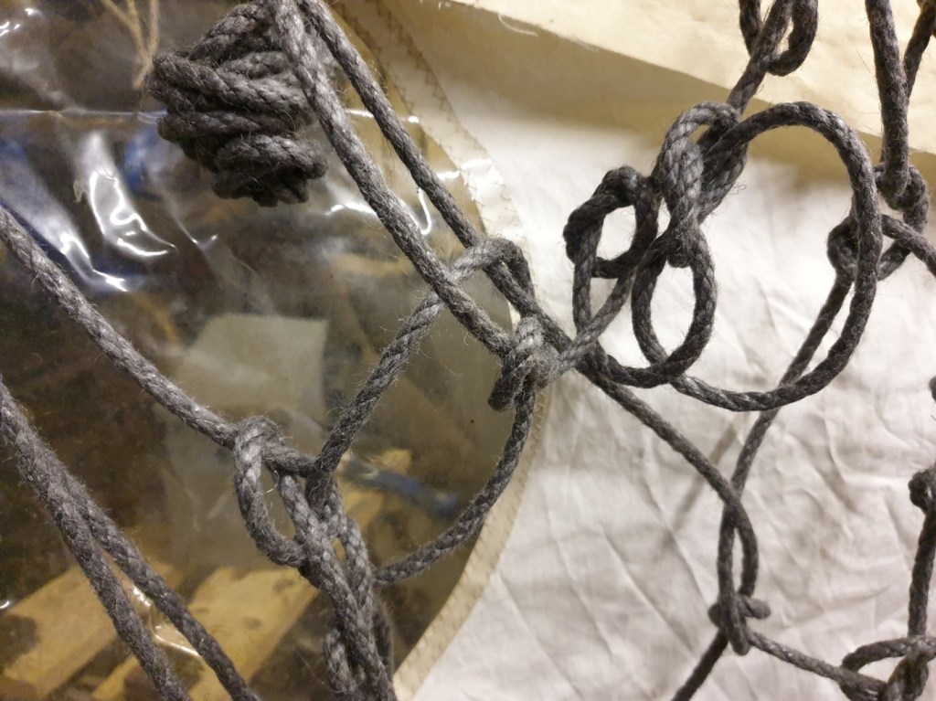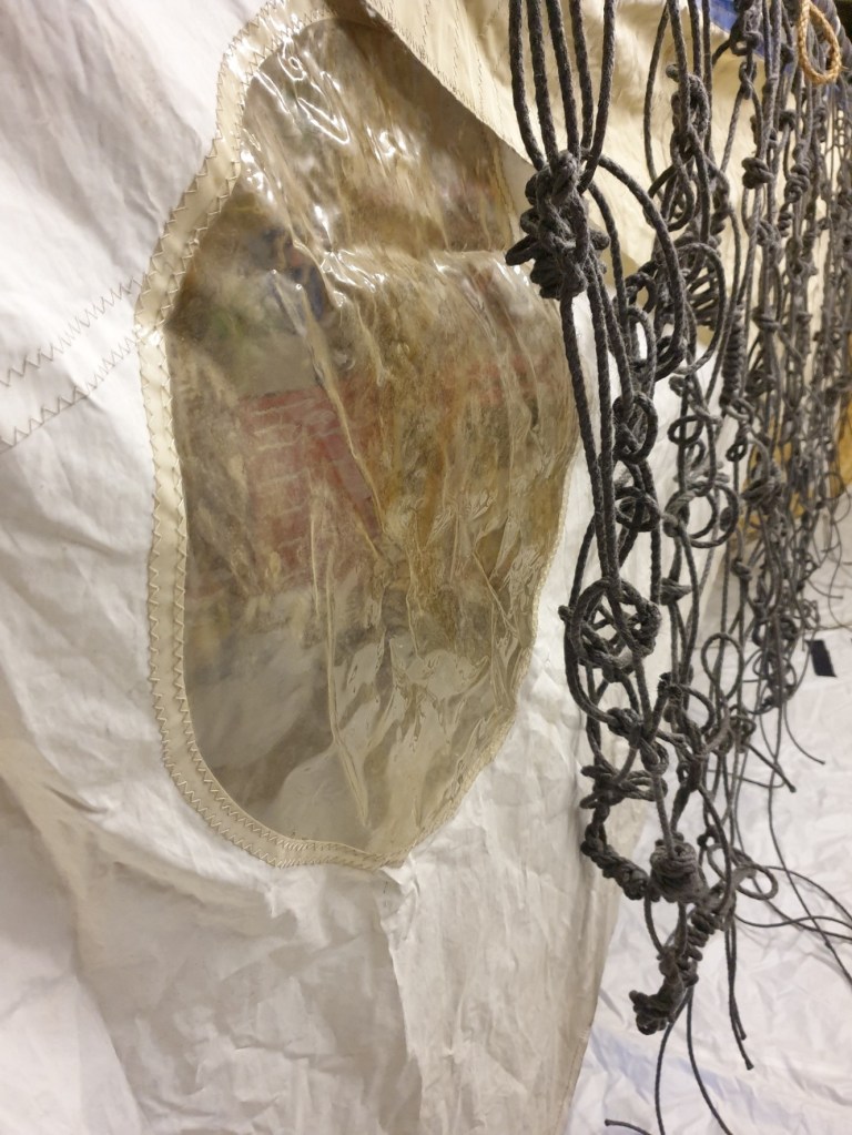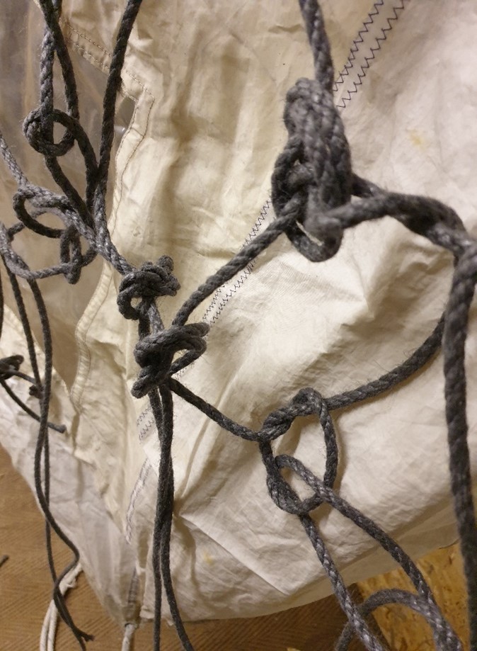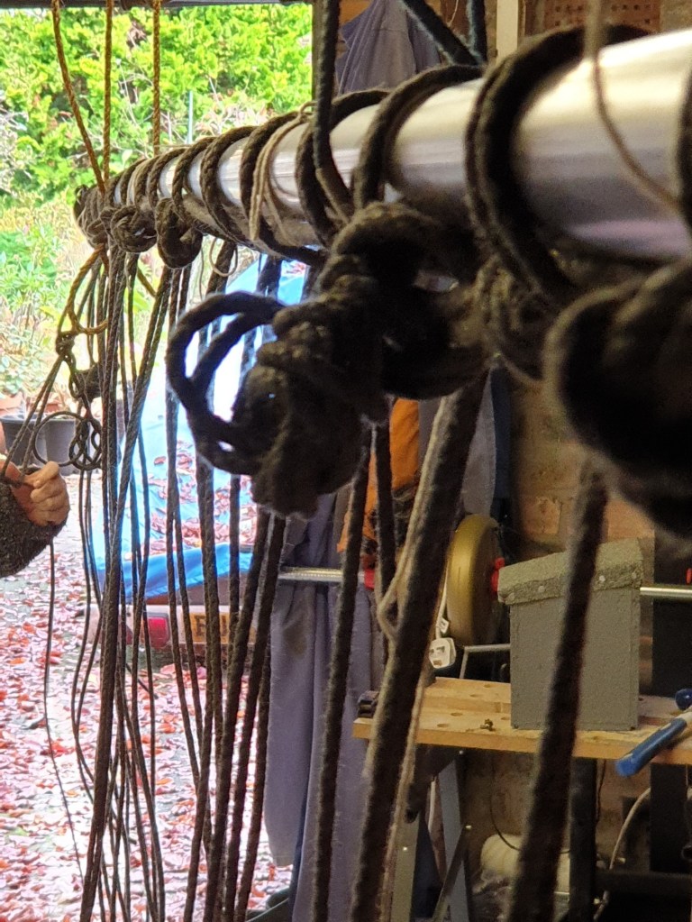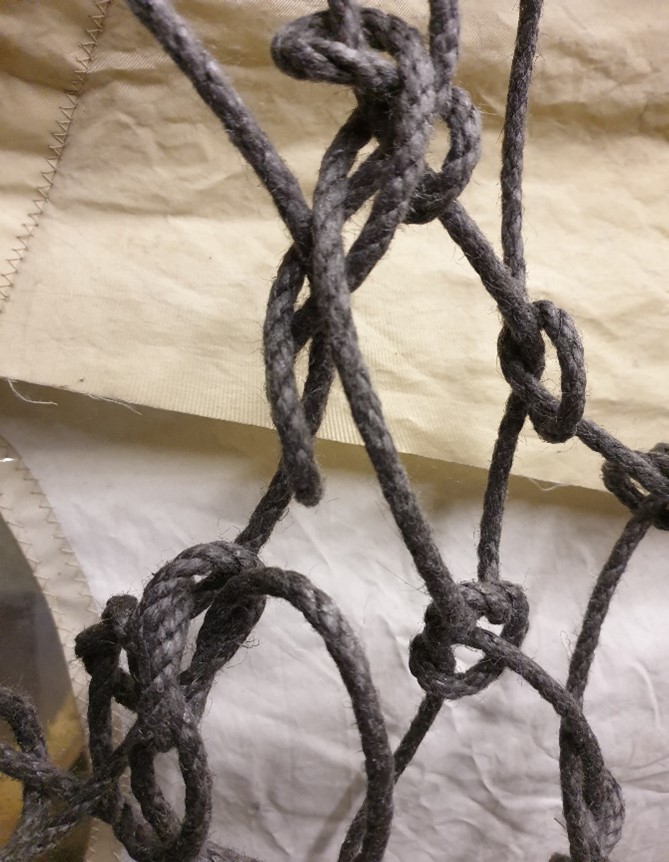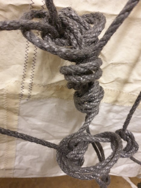 The process of weaving was extremely liberating with its loose and flowing construction. Although initially I could have readily reverted to a more tightly woven weave, I remained focused upon the context which was helped by being surrounded by sails, a mast and related sailing equipment. I could be more easily emersed within the knotting within the weave as so much around me reminded me of the sea and sailing. It was deeply satisfying being in relationship with the used material, to construct in response to the material in use, of relating and responding with the physical qualities of the hempex rope. It brought back memories of playing with rope in my garden with my father as a child just as my son had enjoyed the same pursuit as a child with his grandfather, of trailing out metres of rope from different boats throughout the years to make all sorts of creations. The knotting process within the weave brought back such positive memories as I touched, held, and pulled on the rope. The physical qualities of the hempex rope with the knotting, twisting, and turning evoked such feelings of strength and resilience, of the capacity for further use, to recover despite age and wear. On handling the hempex rope the importance of reuse was felt beyond recycling, of respecting the rope for its own sake and optimising its own qualities to make with meaning, to continue to create with relevance and understanding through the materials, processes and techniques used.