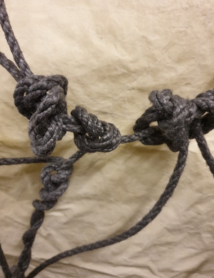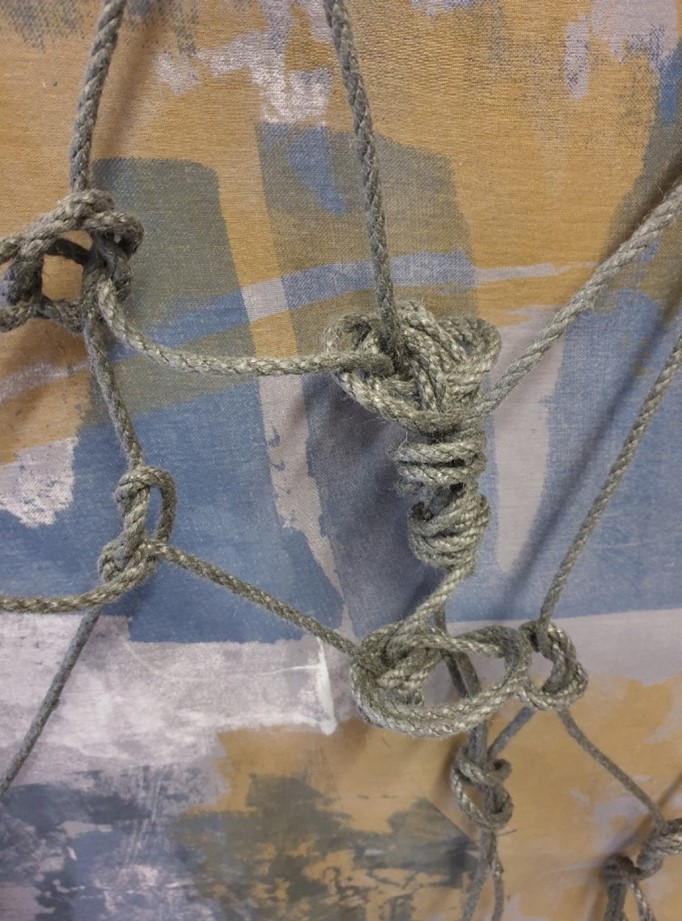 The three-strand rope was firm and flexible, a good choice for loose weaving and more decorative knotting. The hempex rope kinked when being knotted and untwisted readily but held together well. The properties of rope vary according to its construction and composition which yields many possibilities and options going forward for larger scale weaving using a range of techniques and approaches.