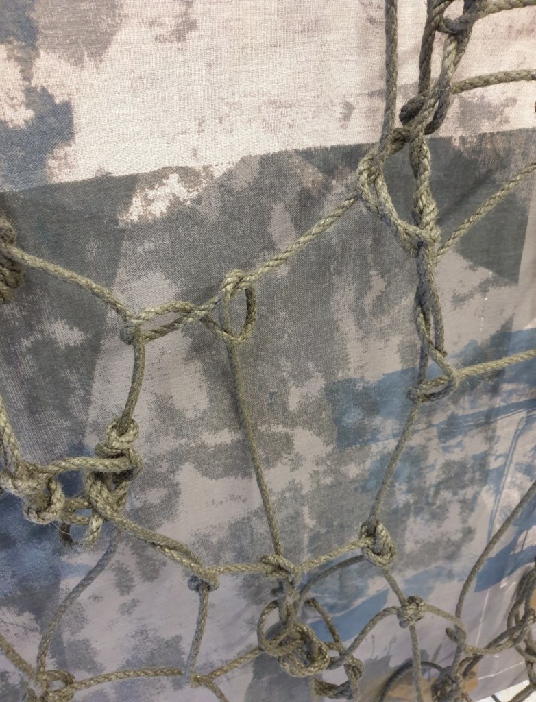Morris (2020) Passing from Sight: Implicit Traces and Imprints of Environmental Breakdown within the Print on Repurposed Sheer Muslin with Entanglement: Compromising Life, Struggle for Survival. Use of an antiqued and worn colour palette of printing inks on sheer muslin with used black 6mm hempex rope. (1.3 x 5 metres)Morris (2020) Passing from Sight: Implicit Traces and Imprints of Environmental Breakdown within the Print on Repurposed Sheer Muslin with Entanglement: Compromising Life, Struggle for Survival. Use of an antiqued and worn colour palette of printing inks on sheer muslin with used black 6mm hempex rope. (1.3 x 5 metres)