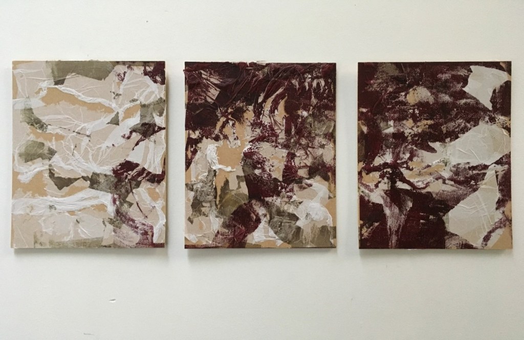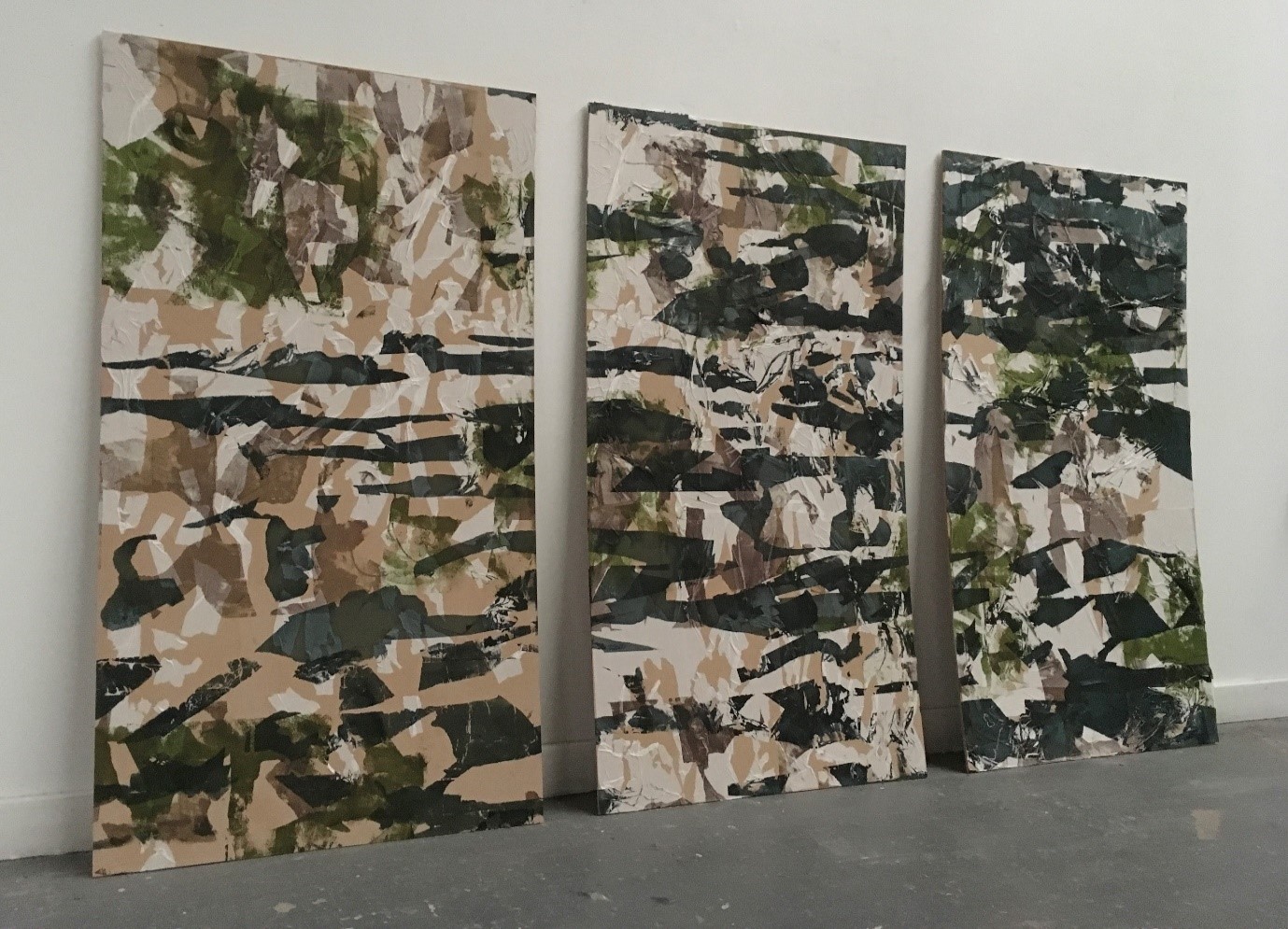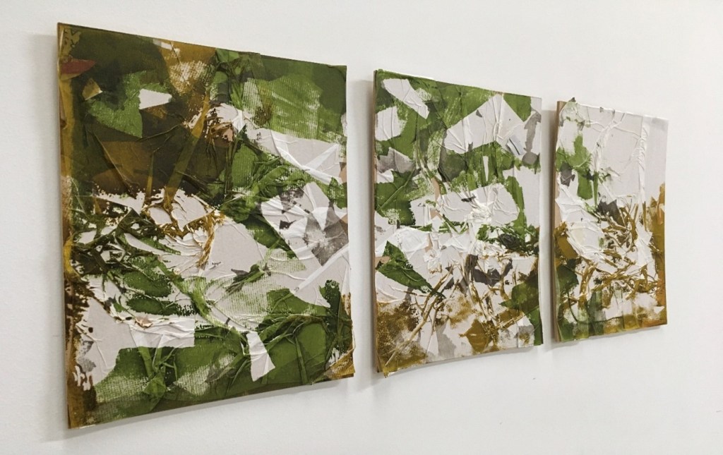 Morris (2020) Torn and Ripped Apart Depletion: Environmental Breakdown. Three Screen Printed 2ft x 4ft 6mm MDF Panels with Fragmented and Ripped Rice Paper, Dull Taupe, Chartreuse Green and Light-Mid Grey Printing Inks and Imagery from Natural Coastal Textures (61cm x 122cm)