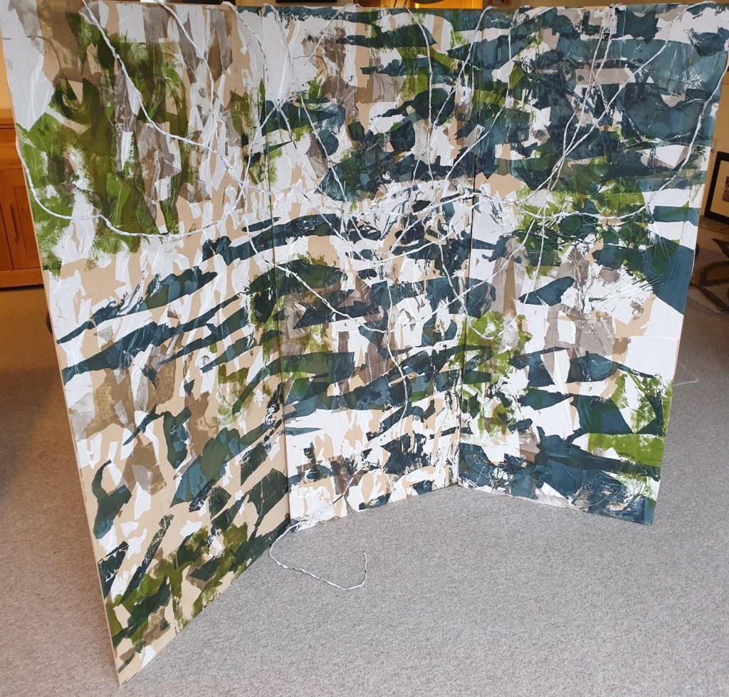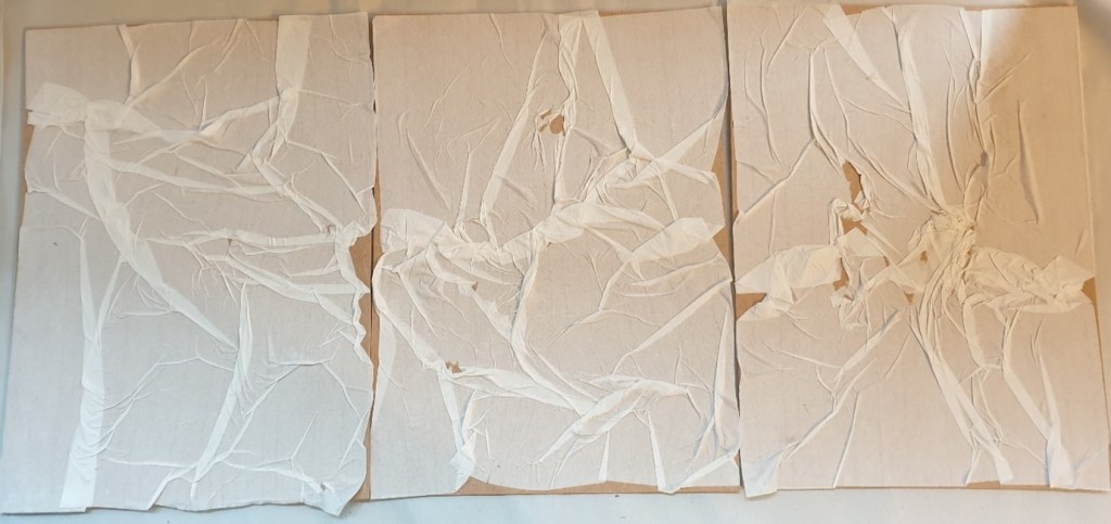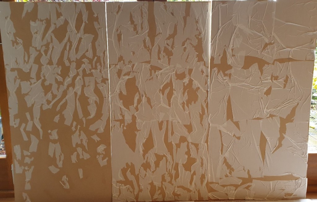 Morris (2020) Three 2ft x 4ft 6mm MDF Panels with Fragmented and Ripped Rice Paper prepared for screen printing to illustrate environmental breakdown, fracturing and increased depletion (61cm x 122cm)