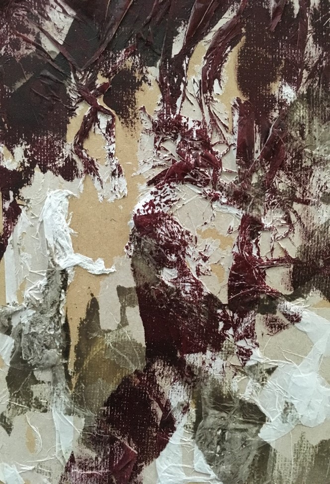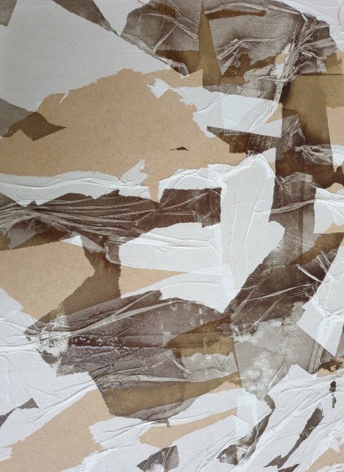 Morris (2020) Detail of Sampling with Two A4 3mm MDF Sheets with Tissue Paper, use of related resist with dull taupe and purply-brown printing inks and imagery from natural coastal textures
