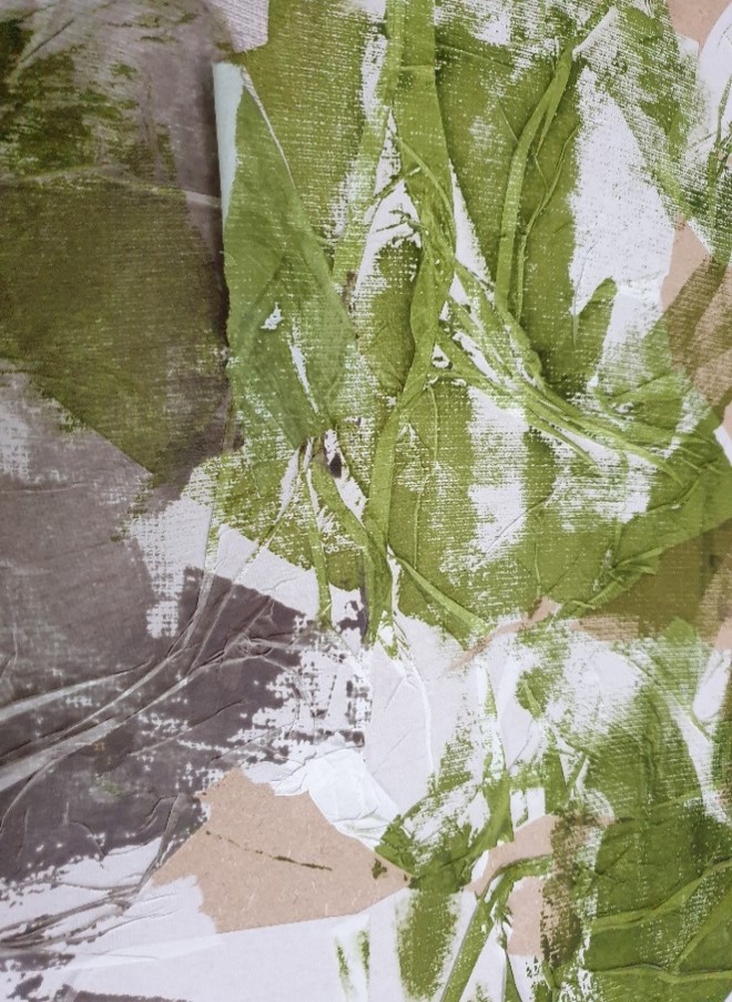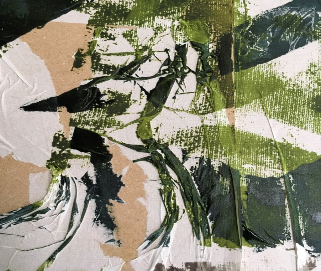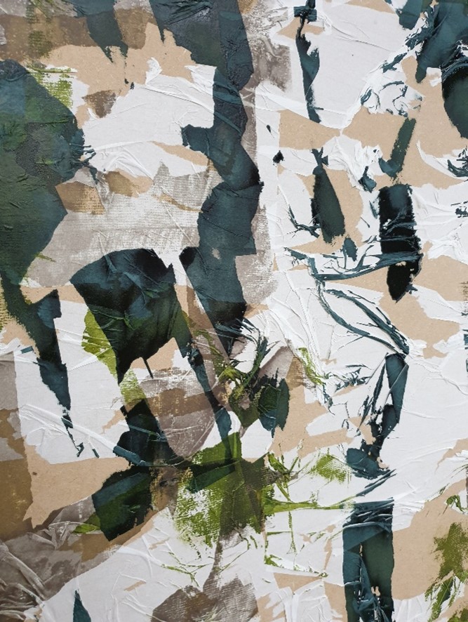 Morris (2020) Detail of MDF 2ft x 4ft 6mm MDF panels with the fragmented and ripped rice paper and third-fourth screen prints using a mix of light and mid-grey printing ink with hand cut stencils on a blank screen to emphasise the effects of splintering and fracturing. The effect of resist can continue to be seen after the different paper types including newsprint have been removed from the surface of the MDF and screen which created more textural mark-making.Morris (2020) Detail of MDF 2ft x 4ft 6mm MDF panels with the fragmented and ripped rice paper and third-fourth screen prints using a mix of light and mid-grey printing ink with hand cut stencils on a blank screen to emphasise the effects of splintering and fracturing. The effect of resist can continue to be seen after the different paper types including newsprint have been removed from the surface of the MDF and screen which created more textural mark-making.Morris (2020) Torn and Ripped Apart Depletion: Environmental Breakdown. Three Screen Printed 2ft x 4ft 6mm MDF Panels with Fragmented and Ripped Rice Paper, Dull Taupe, Chartreuse Green and Light-Mid Grey Printing Inks and Imagery from Natural Coastal Textures (61cm x 122cm)Morris (2020) Detail of Torn and Ripped Apart Depletion: Environmental Breakdown. Three Screen Printed 2ft x 4ft 6mm MDF Panels with Fragmented and Ripped Rice Paper, Dull Taupe, Chartreuse Green and Light-Mid Grey Printing Inks and Imagery from Natural Coastal Textures (61cm x 122cm)
