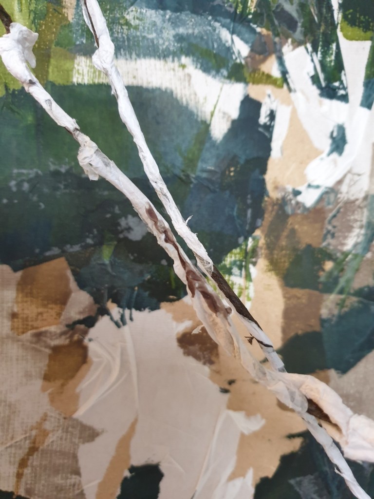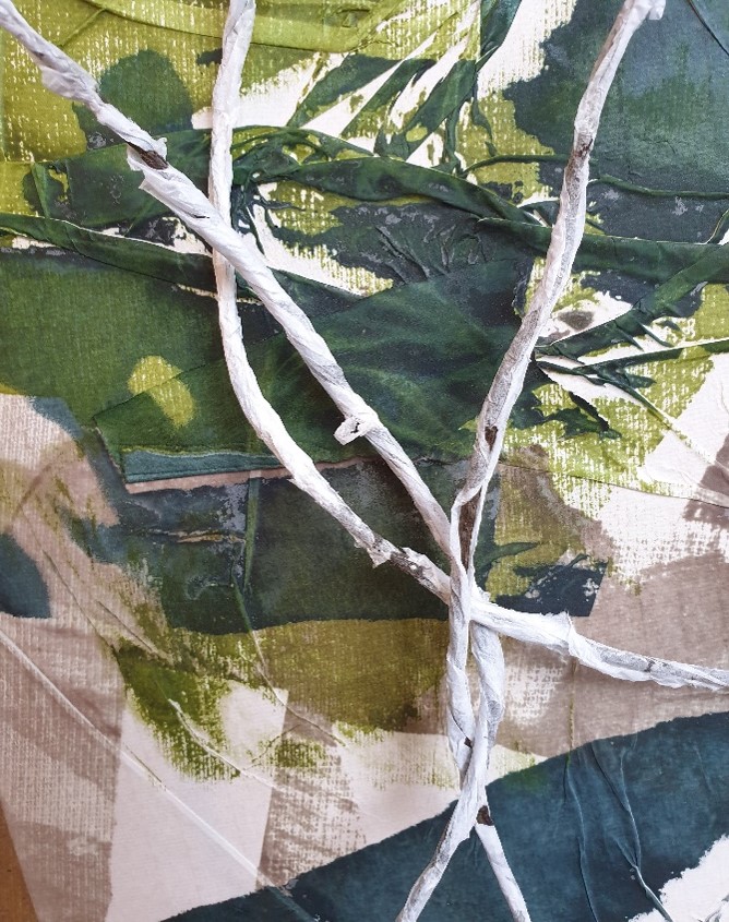 Morris (2020) Detail of Traces and Remnants with Torn and Ripped Apart Depletion: Environmental Breakdown. Three Screen Printed 2ft x 4ft 6mm MDF Panels with Fragmented and Ripped Rice Paper, Dull Taupe, Chartreuse Green and Light-Mid Grey Printing Inks and Imagery from Natural Coastal Textures (61cm x 122cm) with Tissue Paper Woven onto Used 3mm Black Tarred Marline Rope and Loosely Woven across the Screen.Morris (2020) Traces and Remnants with Torn and Ripped Apart Depletion: Environmental Breakdown. Three Screen Printed 2ft x 4ft 6mm MDF Panels with Fragmented and Ripped Rice Paper, Dull Taupe, Chartreuse Green and Light-Mid Grey Printing Inks and Imagery from Natural Coastal Textures (61cm x 122cm) with Tissue Paper Woven onto Used 3mm Black Tarred Marline Rope with Hand Printing using Dull Taupe Printing inks.