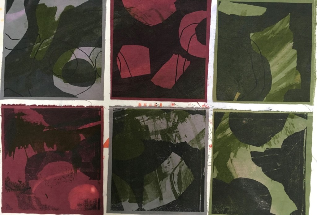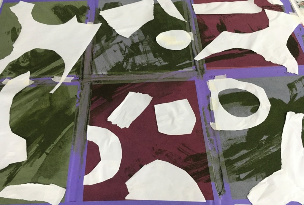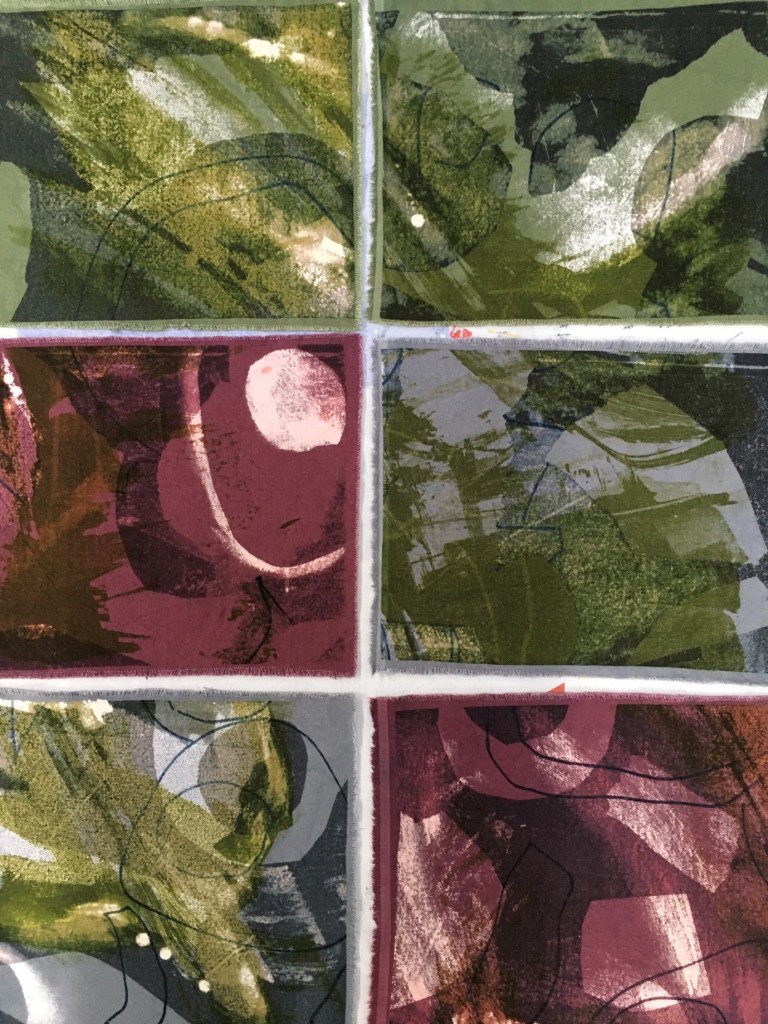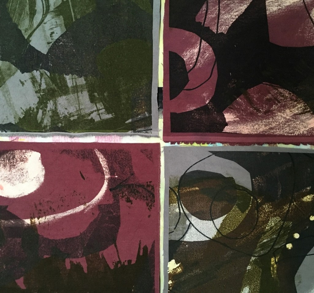 During the screen-printed process different techniques were trialled to produce variable outcomes. I felt that it was a dynamic process as it was immediate and intuitive, I was fully engaged within the screen-printing process, of comparing and contrasting different groups. I worked on for hours to help build up more of a personal relationship with the application of colour and how such colours are seen against different textural backgrounds, colours, line, shape, discharge, stencilling and mark-making, of how the colours, shapes and line interacts…so many inter-relationships were explored. I was drawn into the melding and fading of colours alongside the variations of texture and marks used.