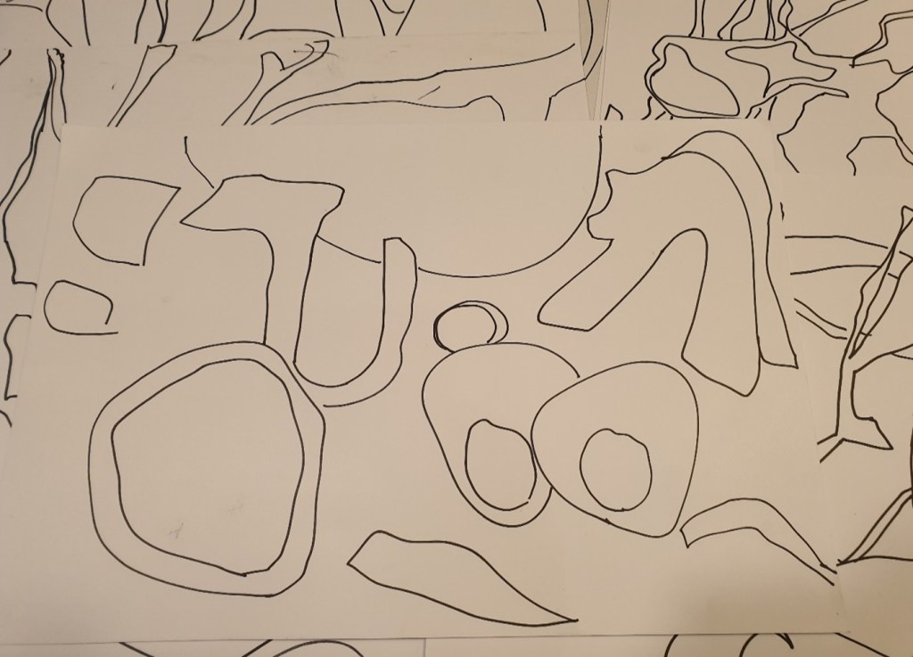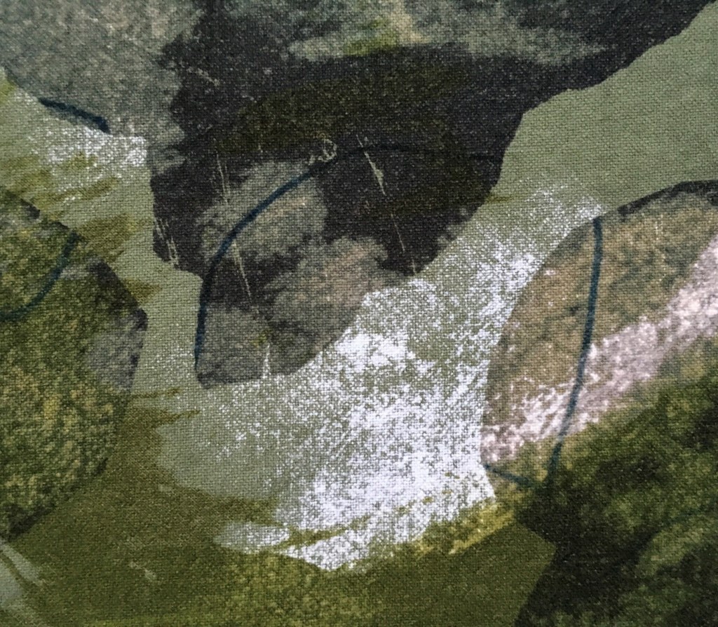 In producing more artwork for the next screen-printing sampling processes much deliberation was required concerning the way forward. I had to reflect upon the imagery which would best suit the increased scale that I would be working on although the series of A3 samples would only reflect aspects of the imagery. Despite this the sampling processes would inform and define the new larger scale work. In using heavy weight upholstery linen for the first time I wanted to capitalise upon the natural qualities of the cloth, of the textural elements with its heightened ability to drape well. That said I eventually choose one acrylic and watercolour painted sketch and one line drawing with pen to offer layering contrasts and sufficiently dynamic imagery with movement and a sense of action. As depicted below these images evolved from nature and natural layering.