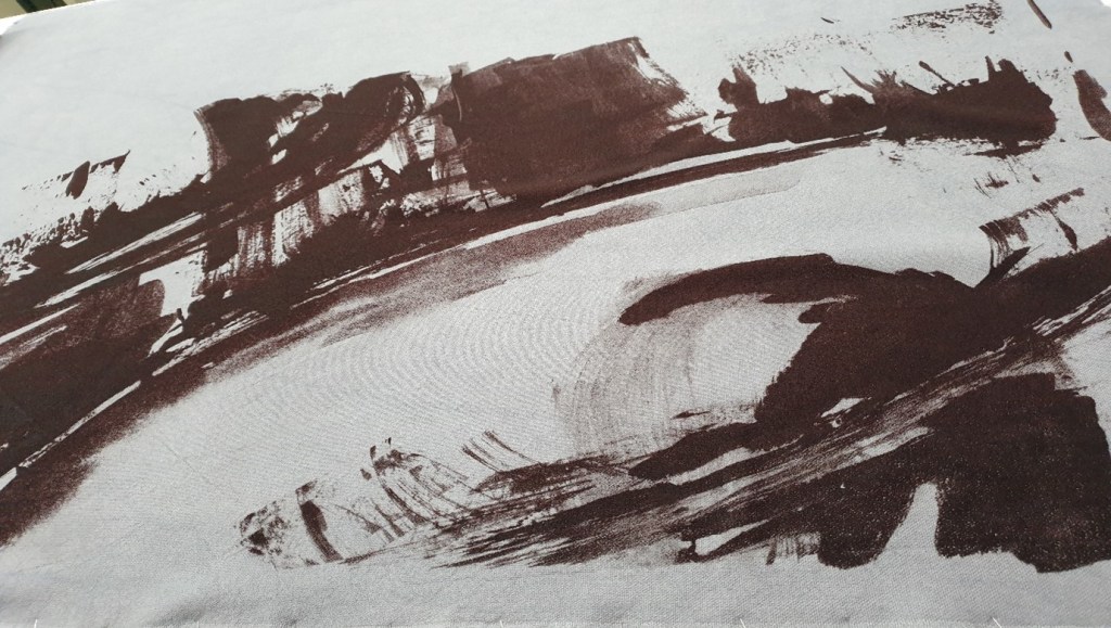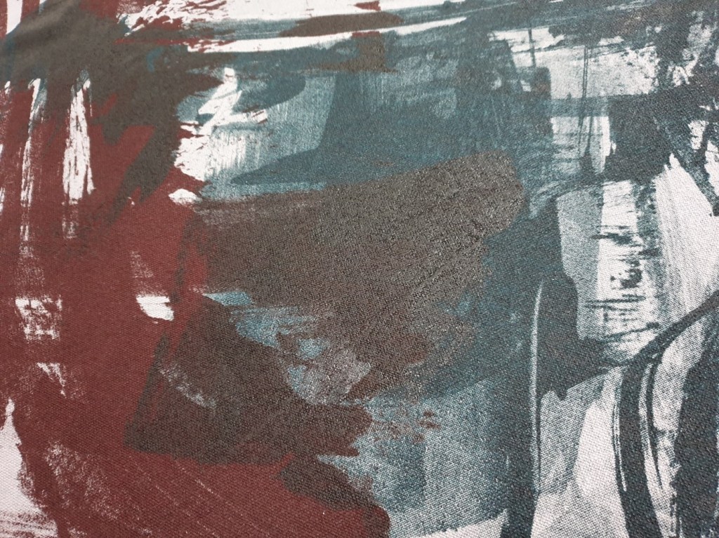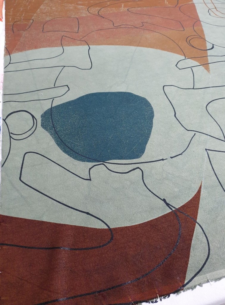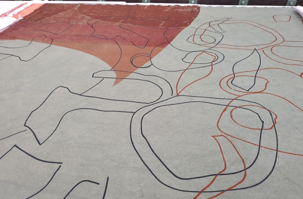 On reviewing the labour-intensive process, the screen sizes were much larger to what I was accustomed to using and were hard to handle. Support was required when printing as each screen size was 168cm x 117cm and 147cm x 122cm which meant greater care was required throughout the creative process. Screen printing became a very physical process through increased scale, weight and size which meant there was greater engagement mentally and physically throughout the screen printing processes with the upholstery linen. There seemed to be a greater degree of focus, immersion, and immediacy during the creative process as the upholstery linen helped to lead the way as each step was dependent upon how the material responded to the print which then influenced what happened next.