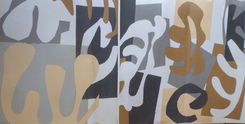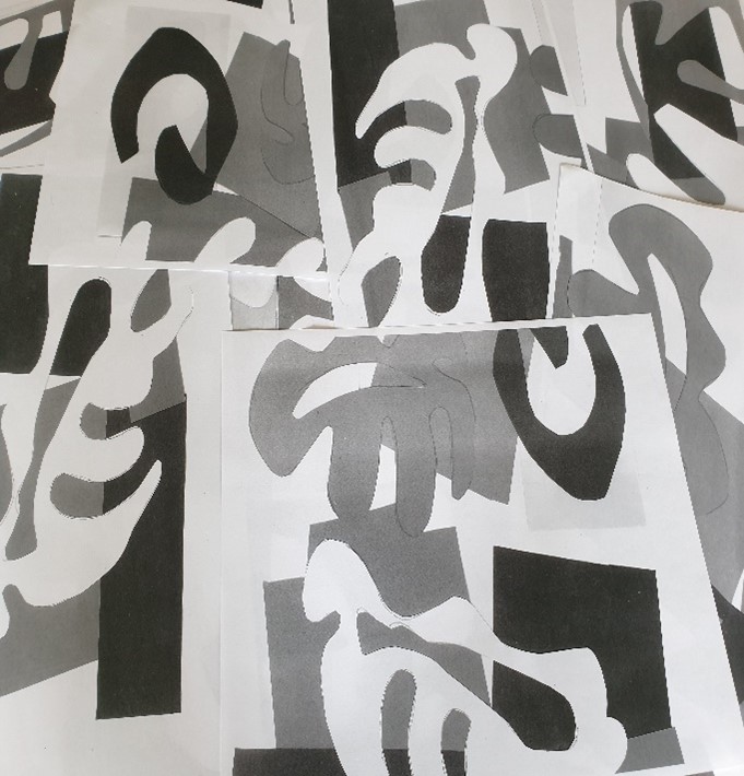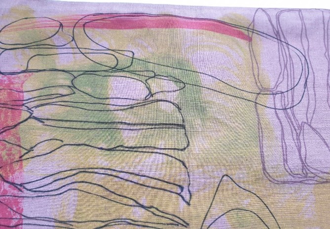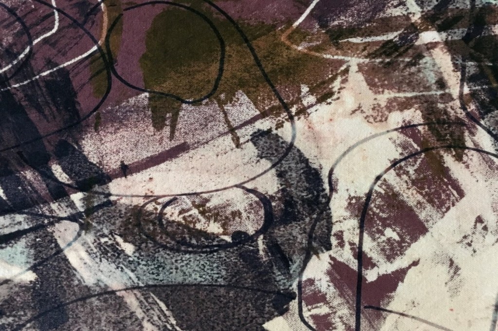 More dynamic mark making included the use of mono-printing using water-based printing inks to add a different dimension to the natural surface qualities in use. As I made progress, I discovered my natural colour, line, shape, textural mark making preferences which felt compatible with the range of options available to me. I have learned so much from experimentation through the printmaking processes and extended my understanding and use of additional printing techniques and methods. While many of the print-making processes using the heat transfer method did not work out as initially planned in going with the creative process I learned to value how the unintended outcomes often led onto more creative opportunities through layering and using the ideas generated to alter the subsequent making processes. I have been enabled through an unintended series of print processes to change directions, to see anew different possibilities, to react and respond in process to generate more meaningful, relevant, and material-led outcomes. In allowing the creative process to be increasingly messy and less controlled I have become more invested and in tune with my making and the meaning it has for me.