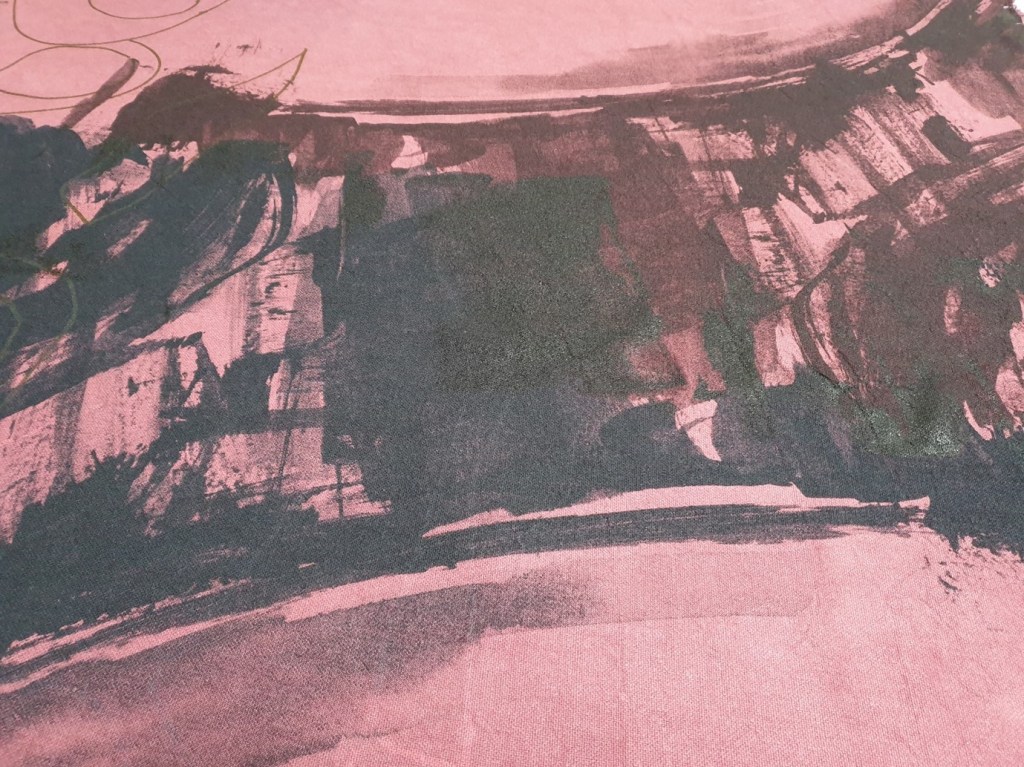 During the screen-printing process different techniques were trialled to produce variable outcomes. I felt that it was a dynamic process as it was immediate and intuitive working directly with the linen. I was fully engaged within the screen-printing process, of comparing different groups and the overall effects. I worked on developing more of a personal relationship with the application of colour and how such colours were seen against different textural mark making backgrounds, line, shape, discharge, drawn stencilling and hand cut masking, of how the colours, shapes and line interacted…so many inter-relationships were explored. I was drawn into the melding and fading of colours alongside the variability of textural marks used… intuitively working with the fabric and its properties. I was conscious of being led by how the linen responded to the reactive dyes and the overlaid colours, of the interplay of material and myself which led onto realising preferred colour schemes. The oxblood, deep turquoise and light grey worked well on the smoke grey coloured linen. The discharge shimmered against such a colour scheme and the colours complimented each other given the mark making within the masked off areas. The sampling process enabled me to select a few preferred colour schemes for my larger scale work given how the colour and mark making had interacted with each other. Ultimately, I selected from the samples which emotionally resonated with me most, which increasingly portrayed this sense of beauty and fragility within the print. The less successful prints had fewer areas which illustrated such desired themes and offered reduced contrasts with areas of interest and impact.