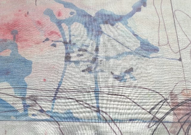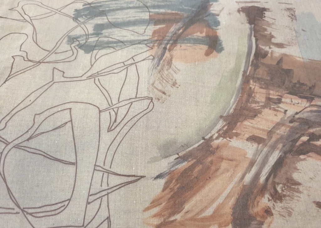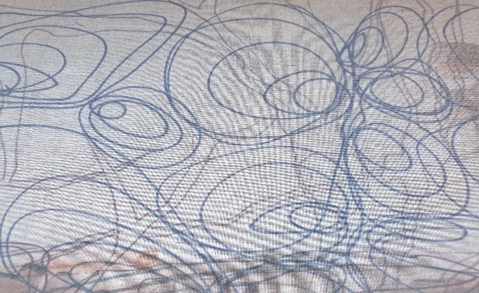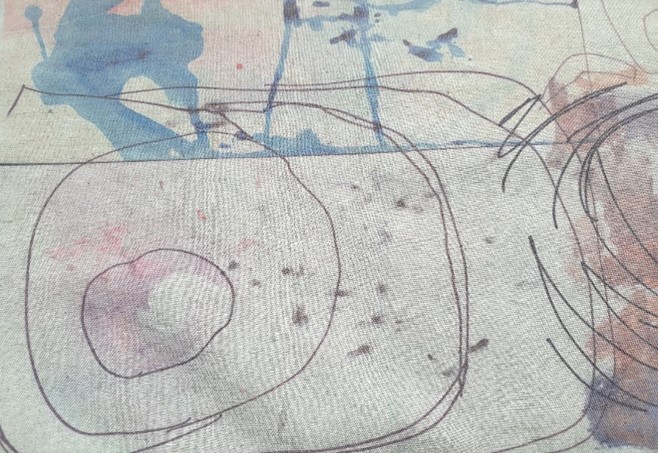 This trial-and-error approach lent itself to greater degrees of experimentation, of layering both complimentary and jarring imagery to create thought provoking groups of overlaid visual narratives with associated aesthetics. Given this process the layering of imagery produced a range of outcomes. When the group of imagery resonated with what I was trying to communicate it went well and it made sense to me. That said there were many occasions where the collected imagery of the A3 pieces of polycotton did not represent a cohesive whole and instead it was disjointed, messy and too difficult to identify and read. Too many overlaid images, colours, textural detailing, and line with shape led to confusing end results. Nevertheless, a lot of learning was gained along the way which led to more thought-out visual placements, arrangements of artwork-colour with texture and painted natural surface qualities and forms set against pen and ink natural outlines. How all the different media and processes including resources were brought together through layering was fundamental to the outcome, see images below using pen and line with texture/colour.