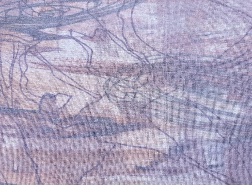 Larger Scale Screen Printed Sampling- Visual Exploration through Extremes in Scale, Colour, Shape and Texture to Create Fragile Interactions from Nature In pulling together my artwork, past learning from prior sampling, skills development through repeated practice and my knowledge and understanding of the relevant processes I felt creatively prepared to work in a scale that was much larger, to experiment further with ways to express what I wanted to say through the artwork used. I focused upon creating three exceptionally large, screen-printed samples using five metres of dyed upholstery linen from end of roll surplus. The imagery was scaled up using 1200dpi on Photoshop to maintain a clear resolution through exposure onto the screens and in print. When scaling up the imagery time was taken to increase and translate the design accurately. Half tone prints were sought through Photoshop to enable a greater sense of detail and delicacy within the imagery. The juxtaposition of the heavyweight upholstery linen which was 766 grams per square metre with the delicate layering of print initially centred upon texture, line and colour helped to exploit the physical properties of the cloth. This visual investigation enabled greater exploration of space, of the effects of all or parts of the imagery through hand cut stencilling and masking off. Increased themes of subtility, delicacy and fragility were realised through experimentation with the imagery on the linen. The use of stencils and masking off areas emphasised a textural brush mark or a drawn line for example. The careful interplay between layers of print highlighted seeped through elements from a layer beneath, to work with and collaborate with the material and its range of possible responses. The ideas invariably evolved from being in relationship with the material through time with good effect. See images of Enveloped- A Personal Response to Natural Forms in Crisis (Morris 2020) in process below to highlight the layering of print, the materials response to the printing process, the interplay of texture with colour including the scale of detailing and the effects of specific areas of textural mark making overlaid.