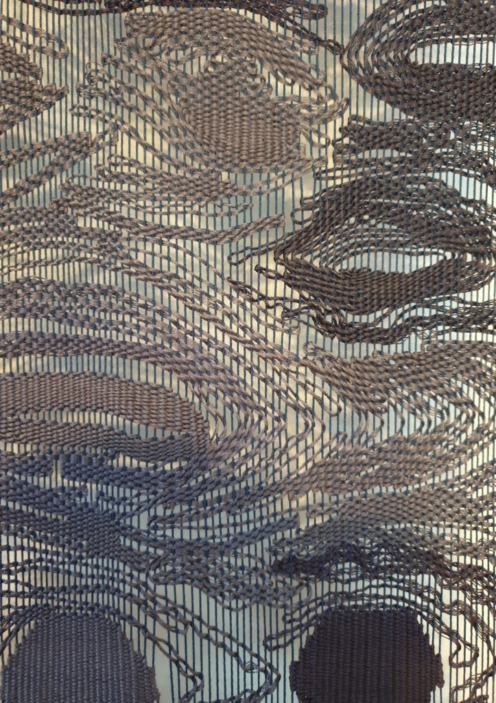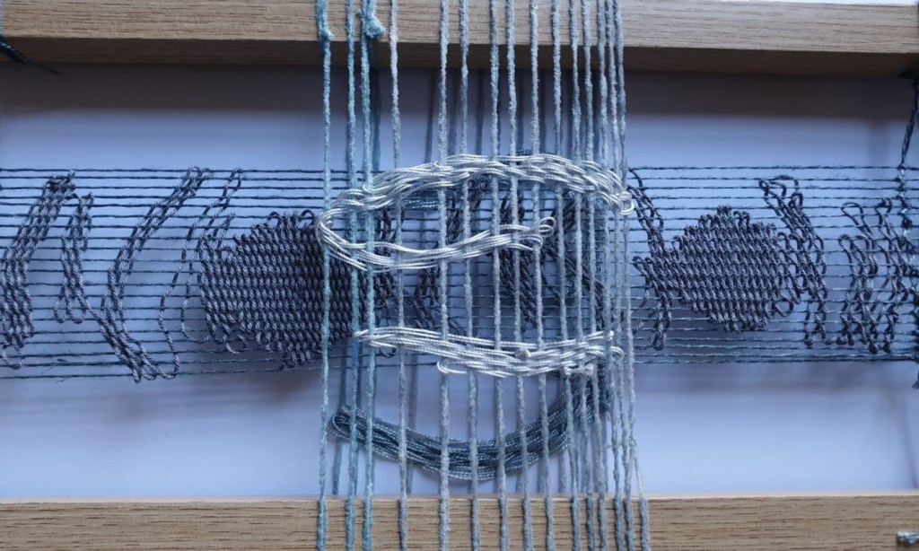 From a series of tapestry weaving sketches, I completed a larger scale sample. While using grey-blue cotton threads for the base layer I used lighter coloured blue cotton for the warp, so it also became part of the narrative. I tried to demonstrate the rhythms of the sea while capturing something of the emotion of water that is always on the move and under threat. I concealed faces within the weaving like African masks to show something of the sea and its displeasure of climate change and marine-coastal pollution. The face either way up illustrates planet Earth and the hurt of man’s inhumanity to nature through pollution and waste, through greed and instant gratification with fast fashion and sweat shops, overproduction and the lack of reuse, recycling, and repurposing.
