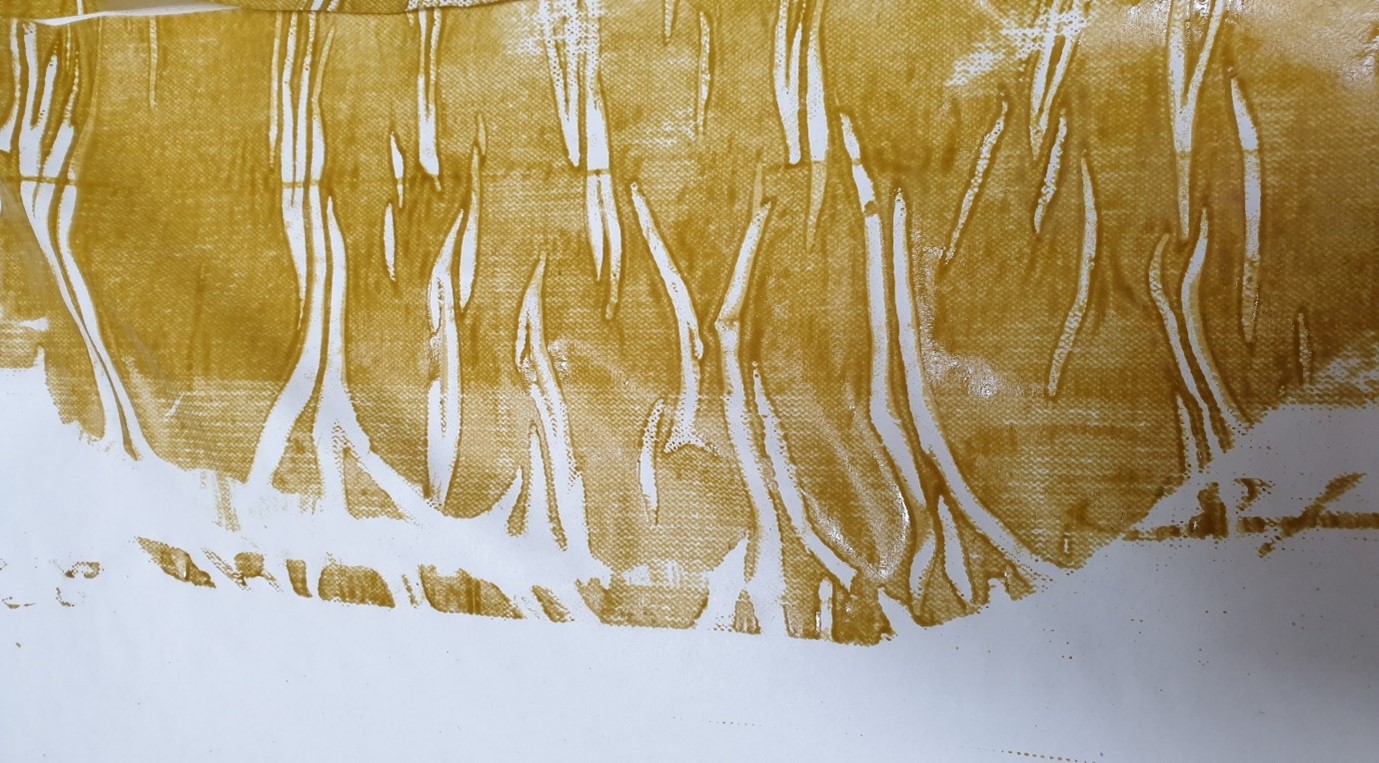 Through sampling processes, I preferred unsized rice paper which was more of a raw product with heightened degrees of absorbency with a soft and textured surface quality. The small squeegee worked well as it could be more readily manipulated to suit the rice paper. Although there were difficulties with the rice paper ripping and pulling apart, this exemplified the underlying theme of fracturing and fitted with what I wished to communicate, of environmental fragility and brittleness and its fight for survival.