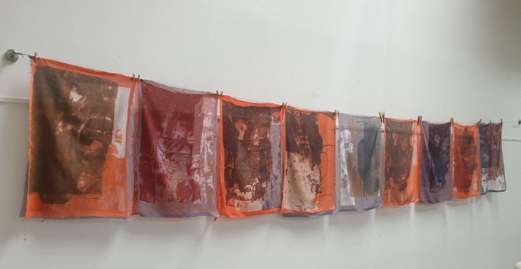 On reviewing the work undertaken for assignment three alongside my tutors’ feedback I compiled my response LINK 1-TUTOR FEEDBACK RESPONSE I was able to reflect upon my continuing narrower direction centred upon my relationship with materials based upon environmentally sound creative practice and processes using print and weave. To reuse materials which promote environmental sustainability and reduced waste to continue to encapsulate related themes of fragility, disintegration, fracturing, through material use and printing ink. The relationship between material, print, imprint, and resist was thoroughly investigated to explore the related themes. As stated in my blog entries and my response to such feedback I increasingly recognised where my strengths lay and what was in keeping with who I am and the way I work. I like to develop relationships with the materials I work with, to be in relationship at a deeper level through an extended investigative process to be more in tune with heightened degrees of personal engagement and reciprocation… as I relate and respond with the material, I am working with I am led by how the material relates and responds back. That said larger scale screen printing has evoked such an emotional connection given the mental and physical engagement which was required with the heighted knowledge and understanding of the material I increased and varied the scale of my work once more through the screen-printing sampling processes with allowed access back into the studio.