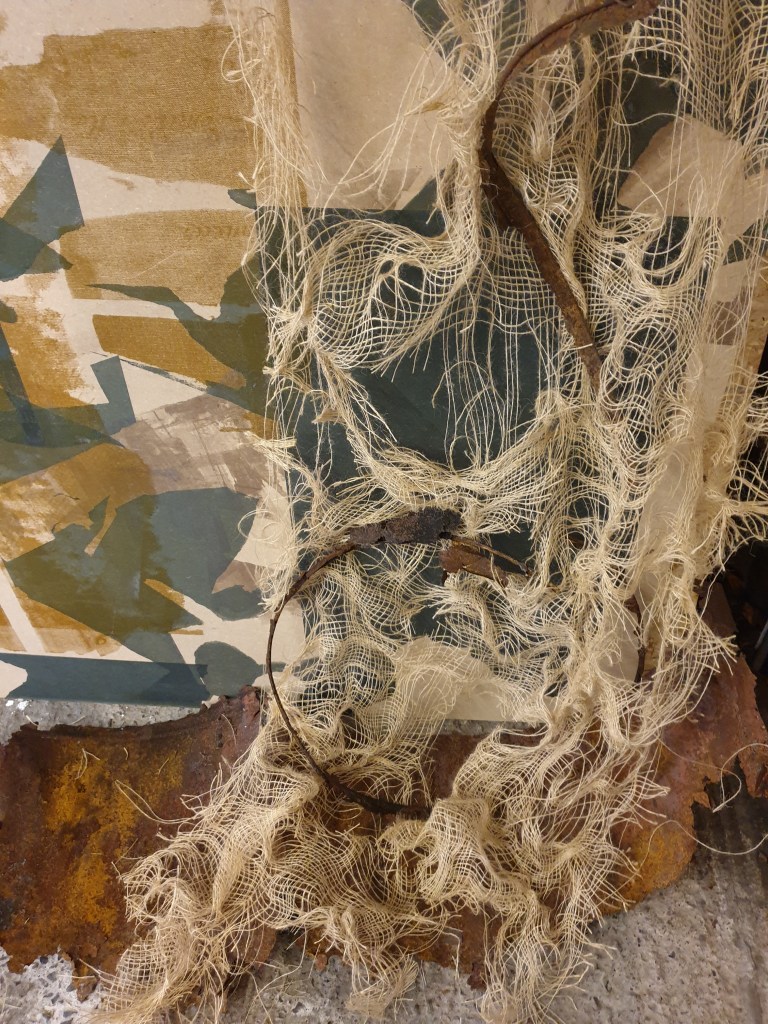 The woollen grey coloured fishermans sweater was ripped and unravelled beyond the ribbed section bottom up to create increasingly dynamic and expressive use of looser weave, of disintegrating yarn bearly held together. I felt that the ripped and fragmenting taupe coloured scrim contrasted well with the grey coloured unravelling wool. While stitching was used this was removed as it seemed to detract from the freedom of the scrim and wool together to avoid any form of restriction and restraint. I felt the process of unravelling mimicked the disintegration and destruction of the environment as sections of the jumper increasingly disappeared from sight. The effects of unravelling as the yarn came apart naturally created entanglements and beautifully formed knitted threads as the wool held on to the shape of the stitching. This then conveyed the stitching I was looking for alongside the woven effects as the remanents of the knitted jumper held its sculptural form. That said the fishermans sweater proved to be indestructable despite years of wear and tear, although every effort was made to respectfully dye and degrade. In considering this additional projects were undertaken to utilise more related elements in line with my preferred narrative and context including found corroded metal objects and repurposed scrim to better convey and accentuate fragility, disintegration and fracturing.