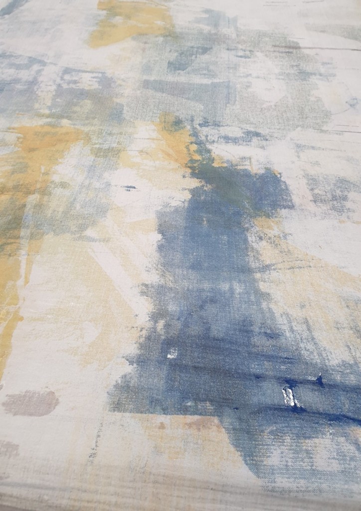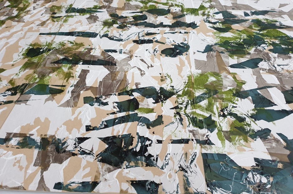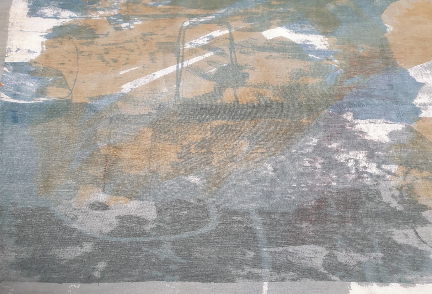 Through the continuous documentation of my personal response to and with materials I have developed and refined my creative practice with a range of materials including sheer cotton muslin, to work in different ways, to be led intuitively in process by the material. From the sampling processes using screen printing on repurposed sheer cotton muslin (70 x 50cm) I was able to articulate a way forward using this material, to recognise its worth larger scale on two layers, one of print and the other of imprint (1.3 x 5 metres).