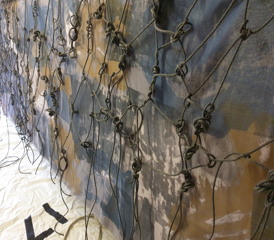 The process of weaving was extremely liberating with its loose and flowing construction. Although initially I could have readily reverted to a more tightly woven weave, I remained focused upon the context which was helped by being surrounded by sails, a mast and related sailing equipment. I could be more easily emersed within the knotting within the weave as so much around me reminded me of the sea and sailing. It was deeply satisfying being in relationship with the used material, to construct in response to the material in use, of relating and responding with the physical qualities of the hempex rope. It brought back memories of playing with rope in my garden with my father as a child just as my son had enjoyed the same pursuit as a child with his grandfather, of trailing out metres of rope from different boats throughout the years to make all sorts of creations. The knotting process within the weave brought back such positive memories as I touched, held, and pulled on the rope. The physical qualities of the hempex rope with the knotting, twisting, and turning evoked such feelings of strength and resilience, of the capacity for further use, to recover despite age and wear. On handling the hempex rope the importance of reuse was felt beyond recycling, of respecting the rope for its own sake and optimising its own qualities to make with meaning, to continue to create with relevance and understanding through the materials, processes and techniques used. Like Susan Beallor-Snyder and her manila rope sculptures I wished to symbolise emotional expression and disruption through the flowing passages of rope alongside the knotting within the weave and the twists and turns of the hempex rope. See related blog entry. https://weaveprint.com/2020/10/13/susan-beallor-snyder-and-her-manila-rope-sculptures/