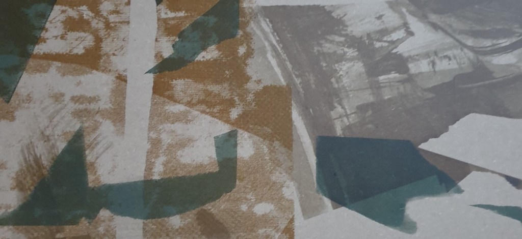 From the sampling processes preferred colourways were realised including use of dull yellow, grey-blue and a selection of greys and blues on grey-blue dyed reused sheer muslin. This colour palette seemed to situate naturally within the context, of the sea and the coast and it felt right as it evoked prior experiencing of the sea and the coast with my family, of being a child on the sand and on as well as in the water…the colours resonated with me at a more visceral level, of feeling the same sensations as I worked with such coloured inks on the cloth. As such feelings were reverberated in process I was led by such feelings, of earlier experiencing being re-enacted which informed the decision-making processes, to select this colour palette for these final extremely large material pieces. To continue to work with identity through colour use, imagery from natural marine and coastal forms-art and collage work and increased scale to feel completely immersed and embedded within the making processes. My own formative experiencing with the sea and the coast with its associated felt sense was expressed through the relational choices made in process including the preferred elements of the layered imagery which was utilised throughout this larger scale screen print process.