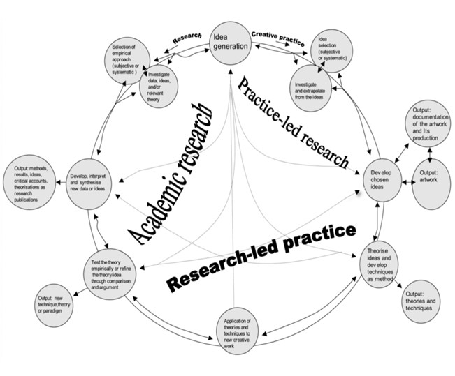 As illustrated above the iterative cyclic web model has helped me to be increasingly methodical concerning practice-led research, research-led practice and academic research concerning the generation and development of ideas (Smith & Dean 2014).