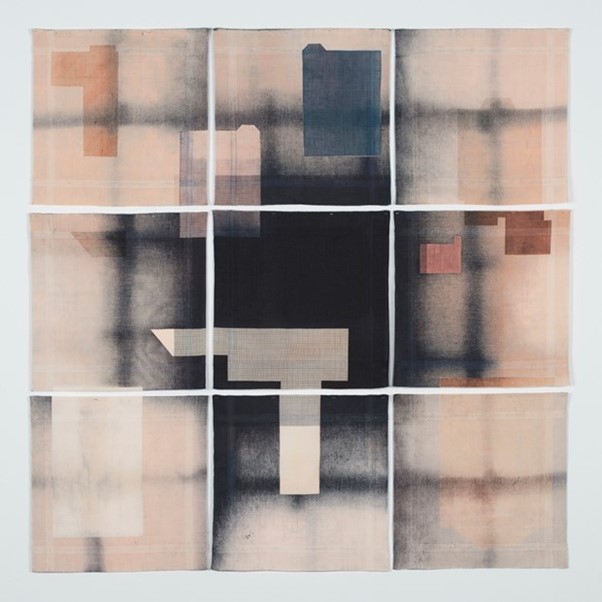 Joanna Kinnersly-Taylor noted that Recast takes as its theme the shifting dynamic of interior space… As we move through our environment, so light changes and our sense of space alters. Using multiple pieces of cloth in a grid format, has enabled Joanna to work on a larger scale than usual. Whilst maintaining a sense of individual compositions, there is also an overall rhythmic structure. This textile artist seeks to capture a particular moment, atmosphere, or environment. http://www.joannakinnerslytaylor.com/