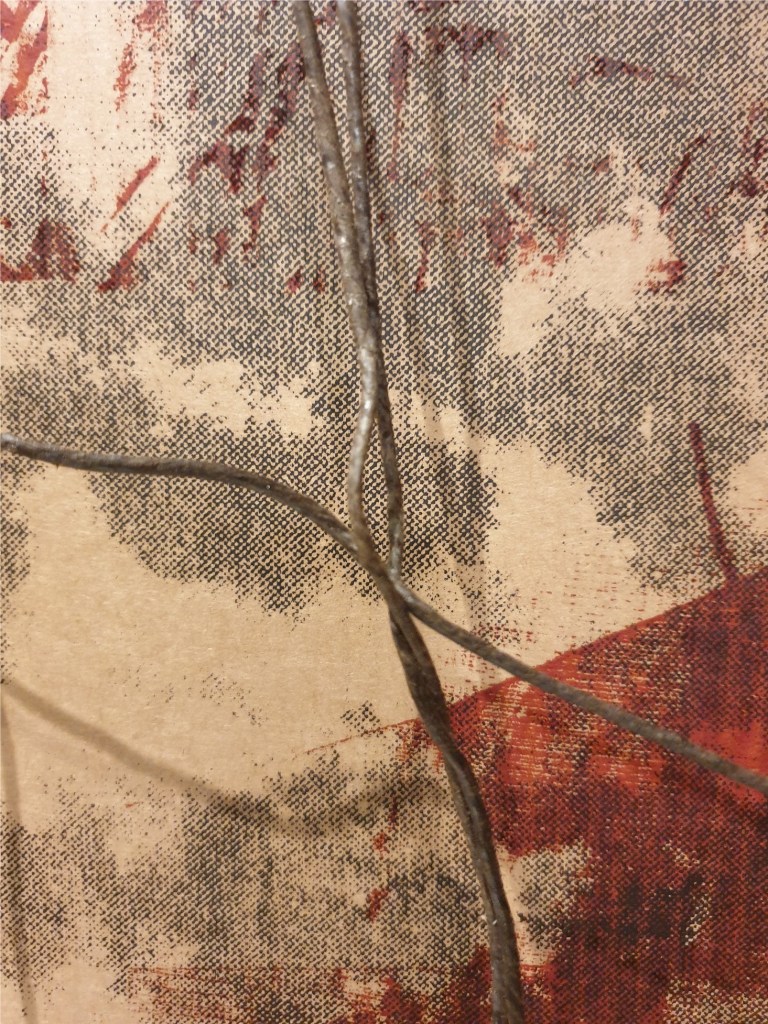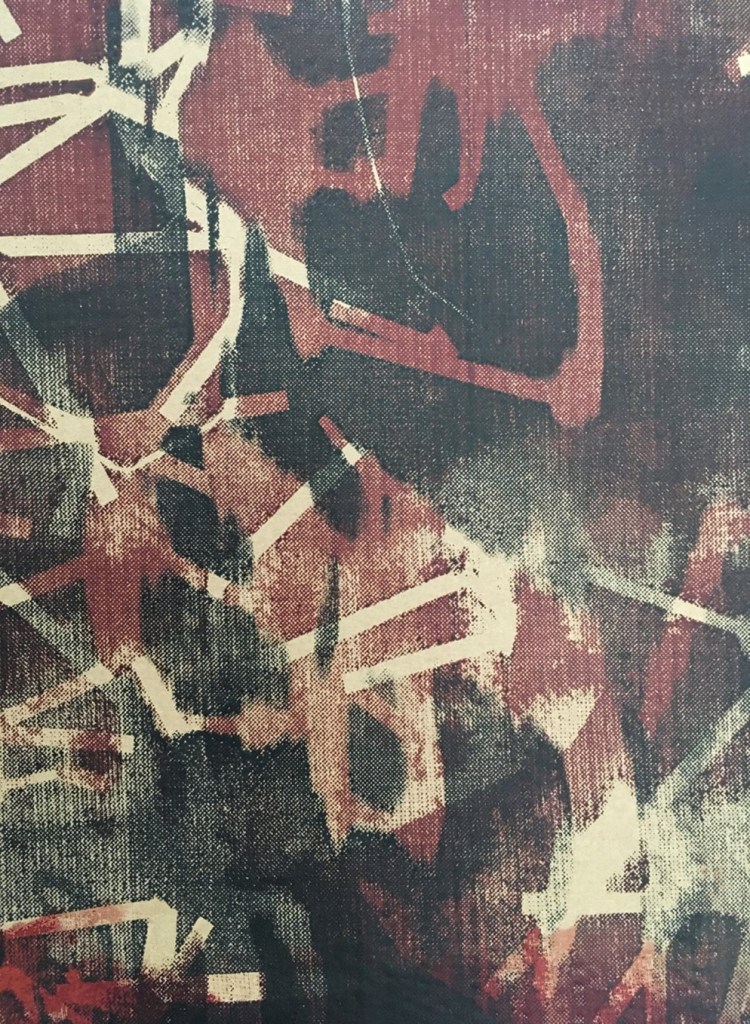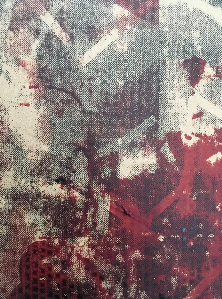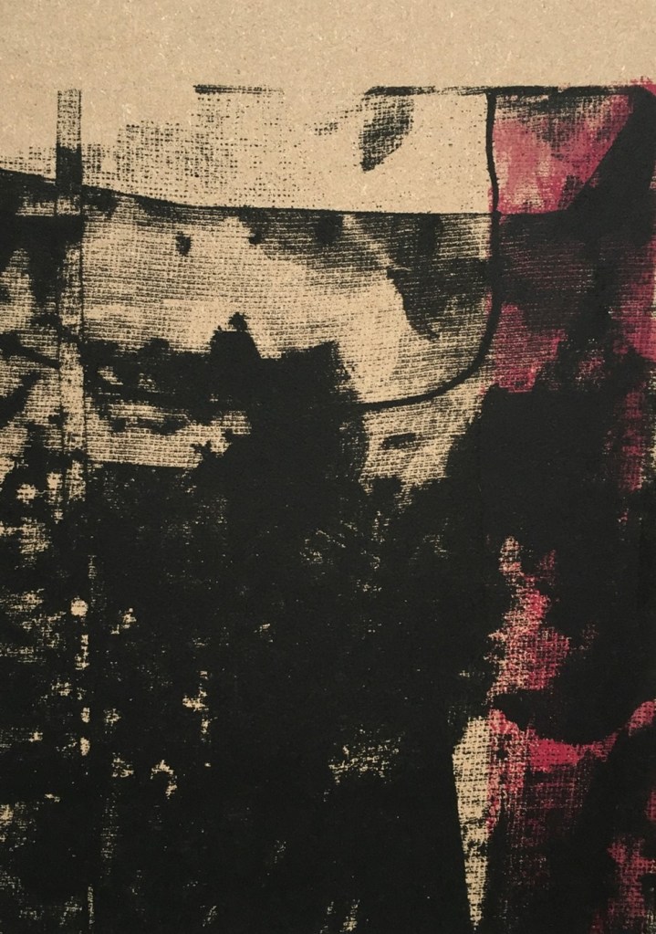 From this series of cardboard prints especially A1 size I felt the more successful outcomes centred around the use of black and brown-red-orange colour schemes with the mixed imagery in use from the original artwork. I felt that the overall size worked well with the scale of mixed imagery. This was helped by the natural brown coloured cardboard and the complementary and contrasting tonal range. As often is the case I naturally gravitated to a more paired back colour range in keeping with the cardboard material. I enjoyed relating with and respecting the physical qualities of the materials I was working with. I felt that I was responsible for promoting the use of such cardboard materials to shine a light on materials which are so often underrepresented in the art world. The surface quality and feel of the printed cardboard surfaces was altered significantly through print. The cardboard distorted fractionally but held its overall integrity which created more impactful results.