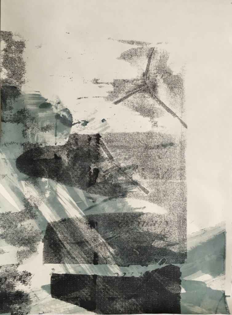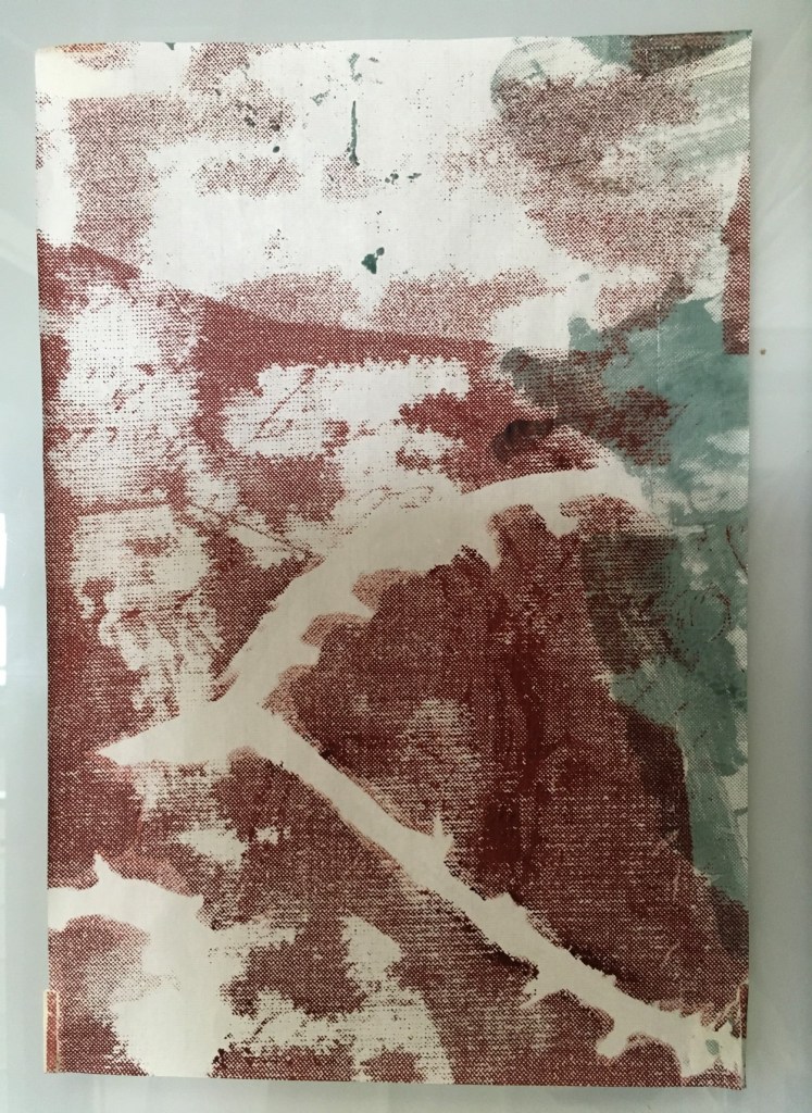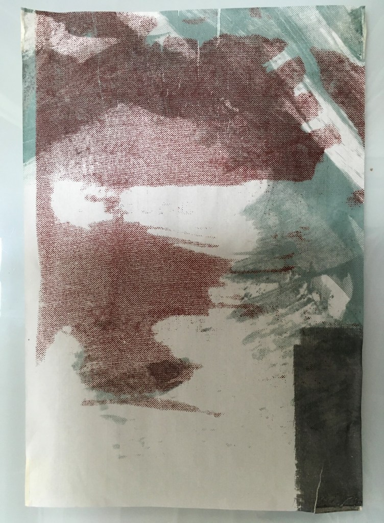The imagery which worked best appeared to be the examples with a more equitable balance between print coverage, imprints, space, and colour between the left-over printing inks of translucent pale green and brown-red-orange. Areas of more dynamic mark making from both the exposed imagery on the screen and the use of smaller squeegees within selected areas of the imagery also contributed to the eventual outcome.