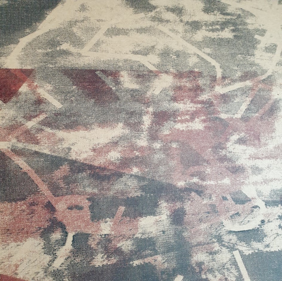 On several of the pieces of rice paper recycled resist materials were used including fringing and threads to create added contrasts and areas of interest. The resist worked well however this often-created additional fracturing as the rice paper was no longer completely flat during the screen-printing processes. With its sheer quality little pressure could be tolerated before fracturing which exemplifies the current environmental balance between life and death, survival, and extinction. I really enjoyed the immersive quality of this creative process and its juxtaposition with nature.
