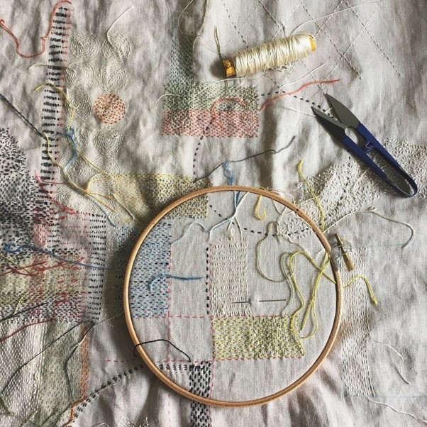 I fully appreciate the value of slowing down, being fully present with increased noticing and letting go…with a naturally mindful pursuit like hand stitching, of the benefits to mental and physical health and wellbeing. Mindfulness practice is often advocated and actively encouraged within the arena of adult mental health, of the multiple advantages to body and mind when able to accept and acknowledge rather than avoid and ruminant. I like and I am influenced by the layering analogies within the repair dialogues, of adding value through stitch, of fully embedding the stitch within the material’s own narrative. As Claire Wellesley-Smith noted stitching to repair something adds a layer of narrative to the object, my personal relationship to it is changing from a passive to an active one (2021 p.74).